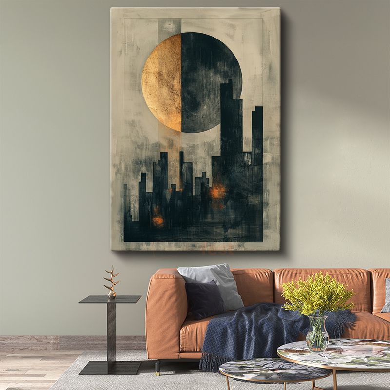 Kentsel Dualite - Altın Ay ve Gökdelenler Soyut Kanvas Tablo