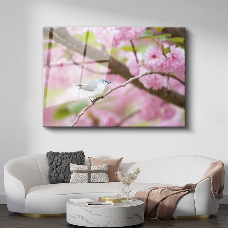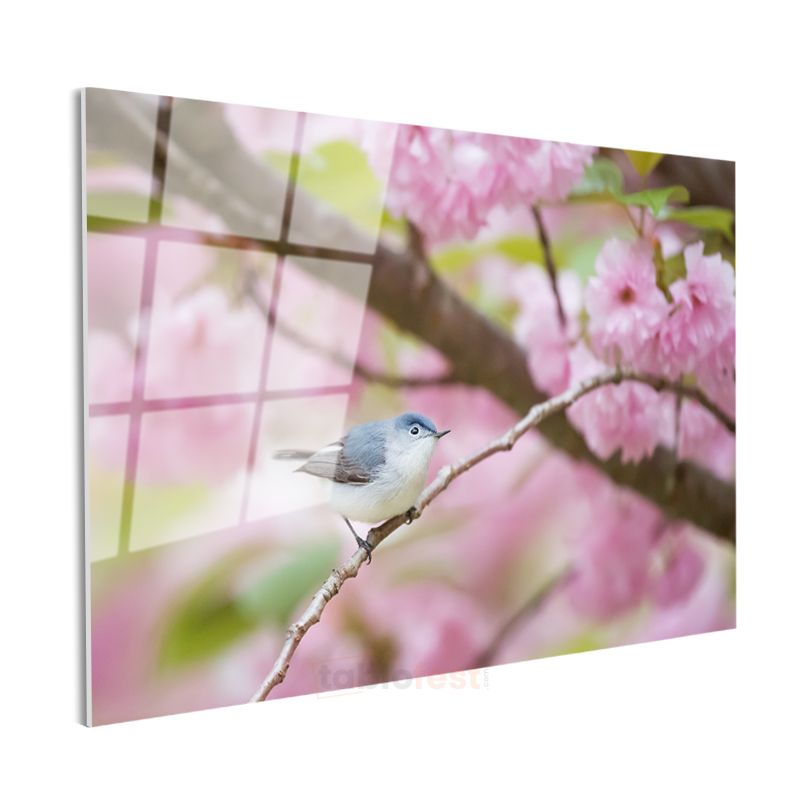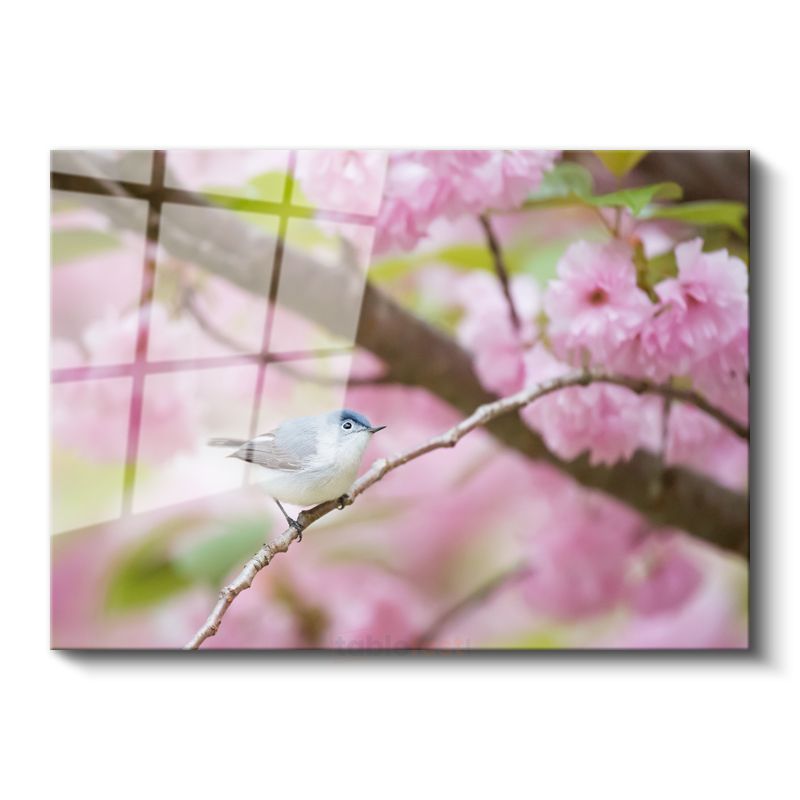 Kiraz Çiçeği - Bahar Dalında Mavi Kuş Cam Tablo