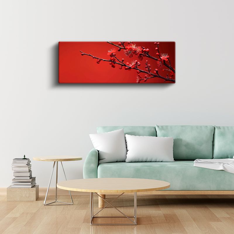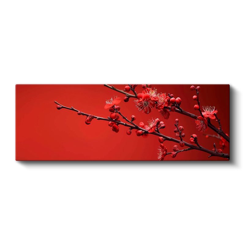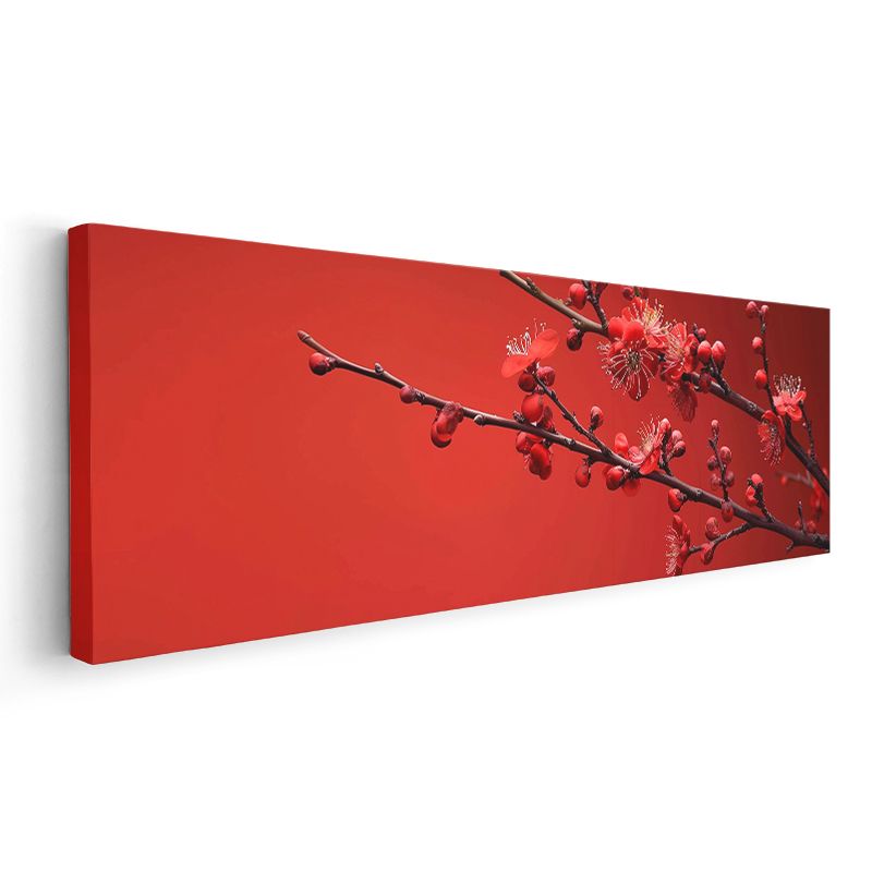 Kiraz Çiçeği Dalı - Canlı Kırmızı Zeminde Bahar Tomurcukları Kanvas Tablo