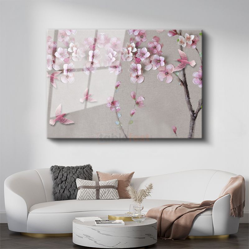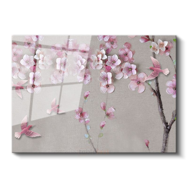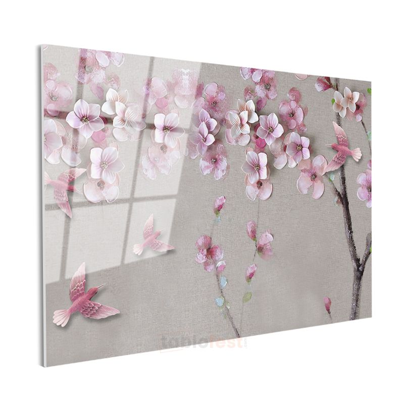 Kiraz Çiçekleri - Pembe Tonlarda Kuşlu Bahar Dalları Cam Tablo