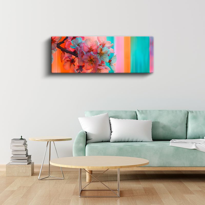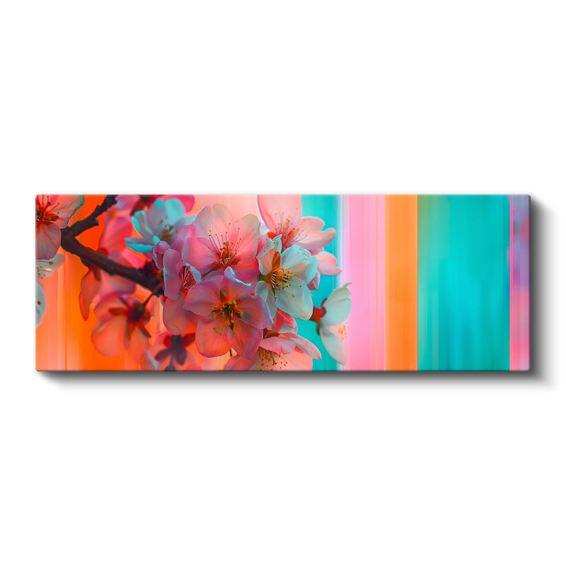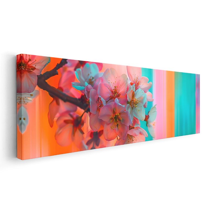 Kiraz Çiçekleri - Renkli Çizgili Modern Tasarım Bahar Dalları Kanvas Tablo
