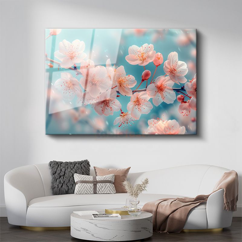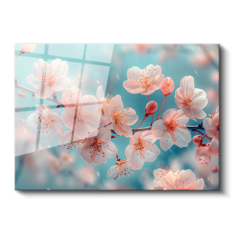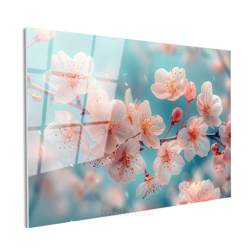 Kiraz Çiçekleri - Turkuaz Fonda Bahar Esintisi Cam Tablo