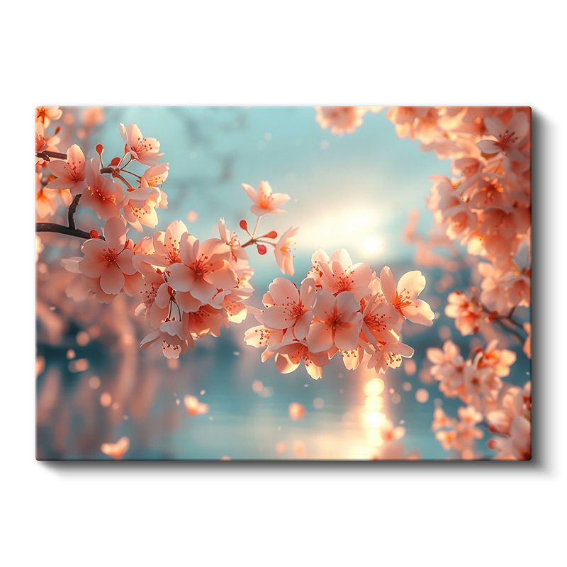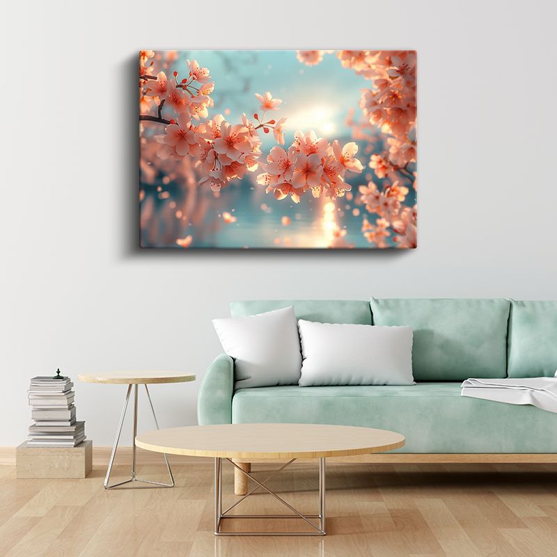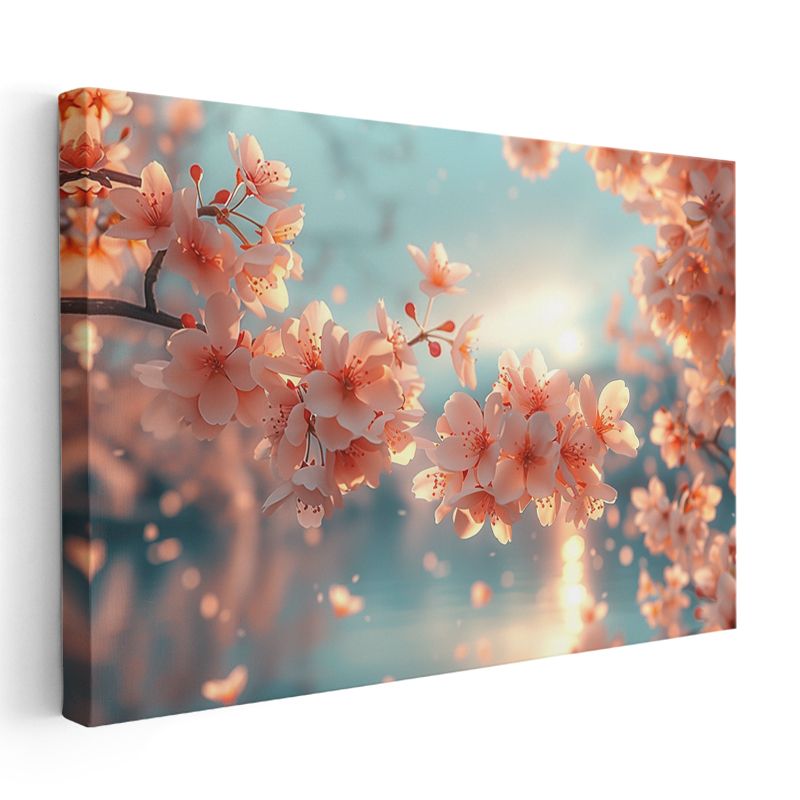 Kiraz Çiçekleri - Turkuaz Fonda Işıltılı Bahar Dalları Kanvas Tablo