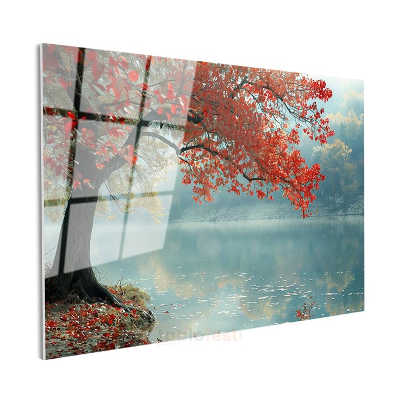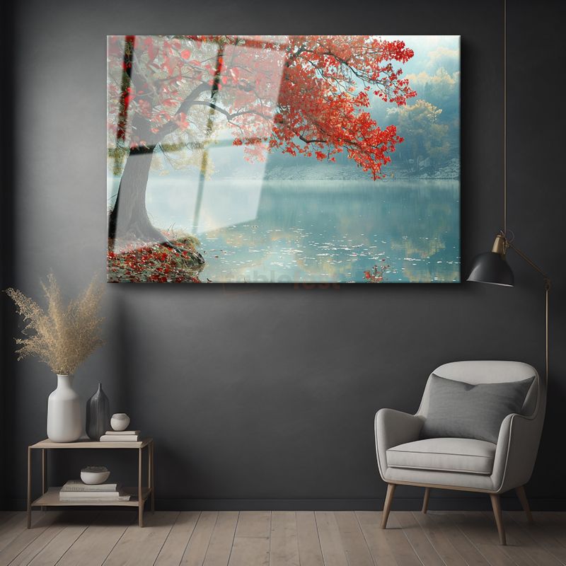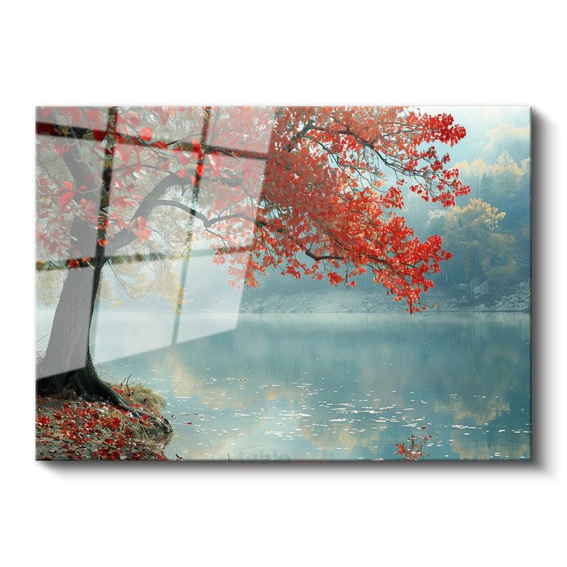 Kırmızı Ağaç - Sisli Göl Kenarında Huzur Cam Tablo