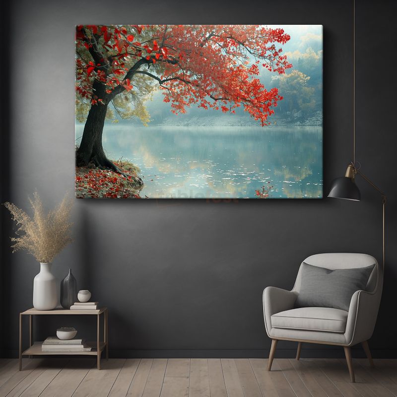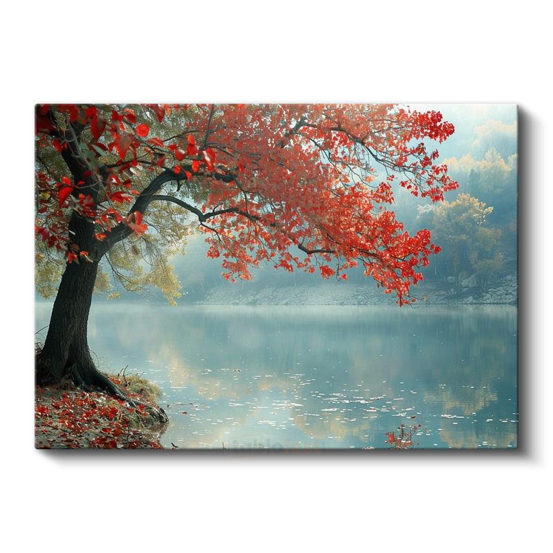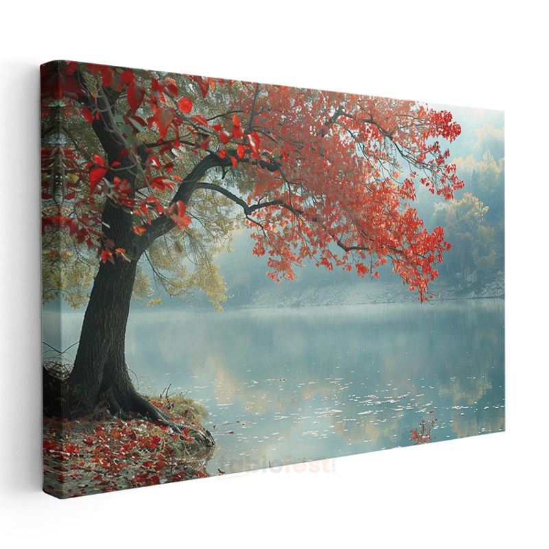 Kırmızı Ağaç - Sisli Göl Kenarında Huzur Kanvas Tablo