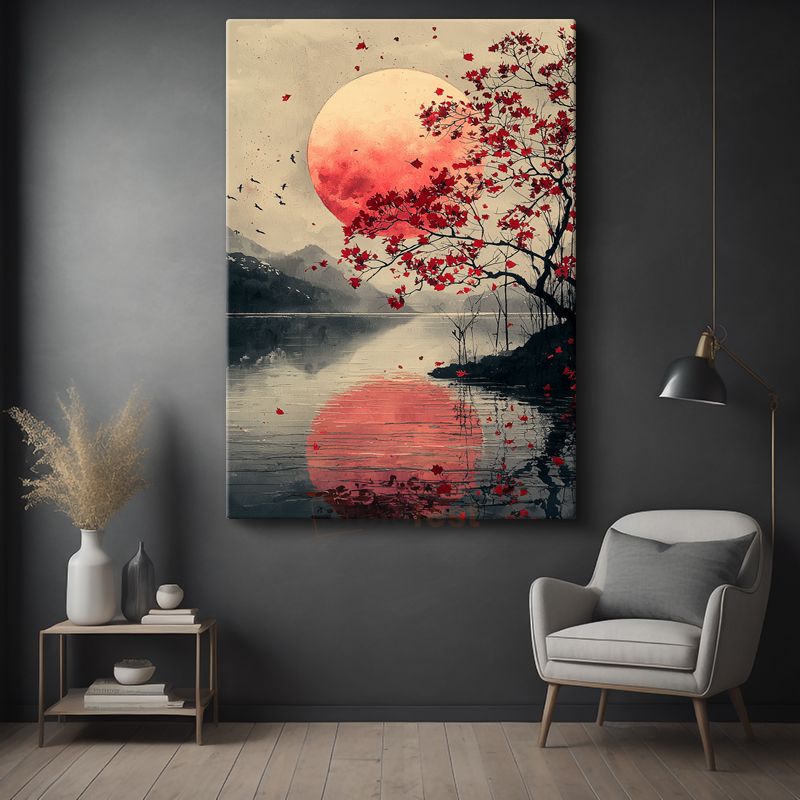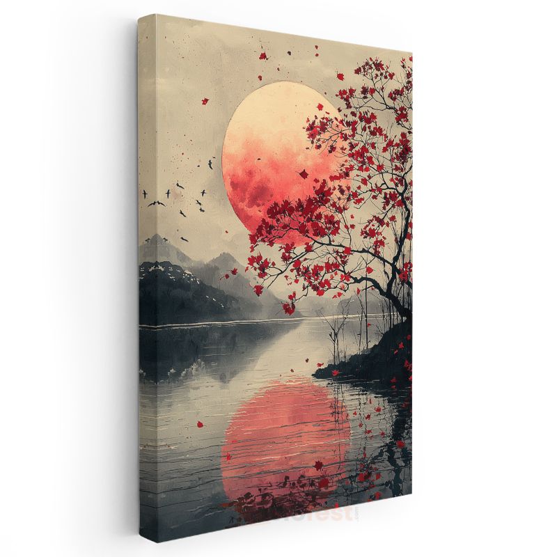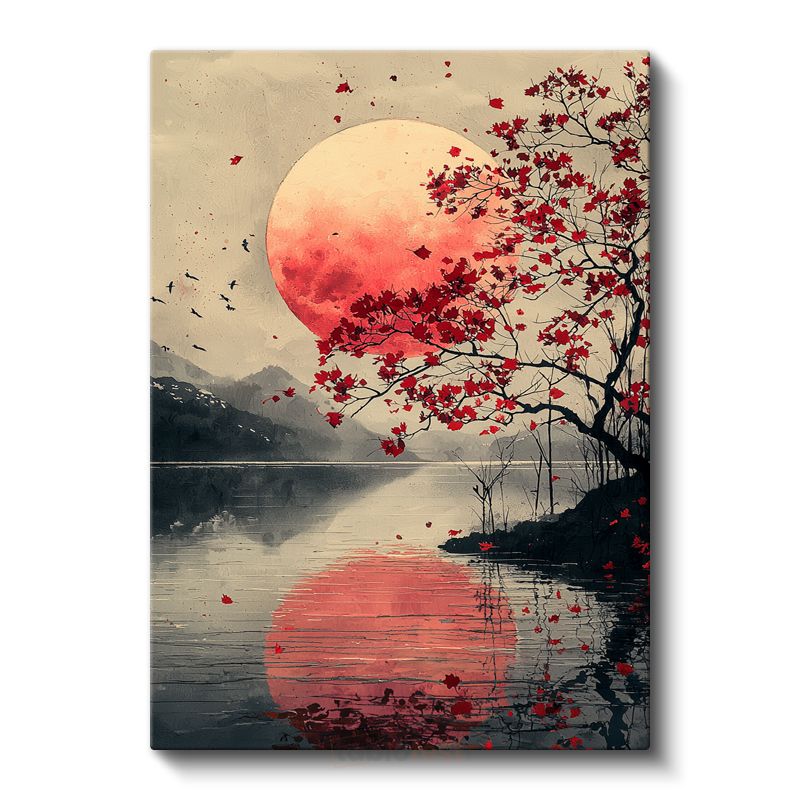 Kırmızı Ay - Kiraz Çiçeklerinin Gölgesinde Yansıyan Huzur Kanvas Tablo