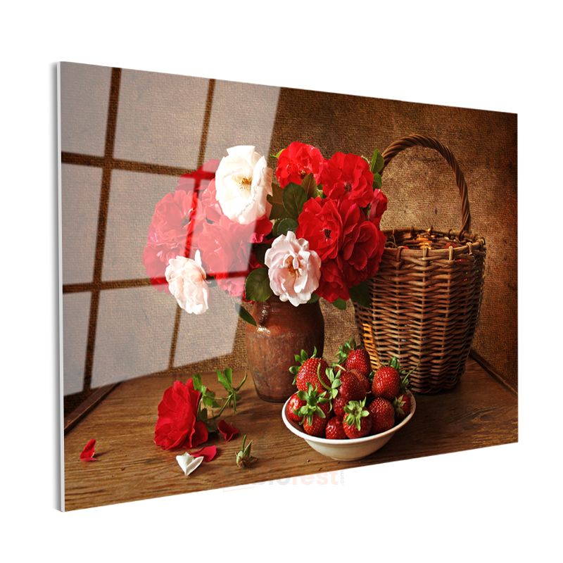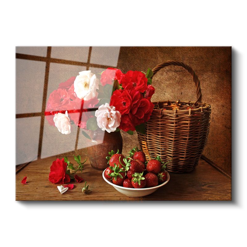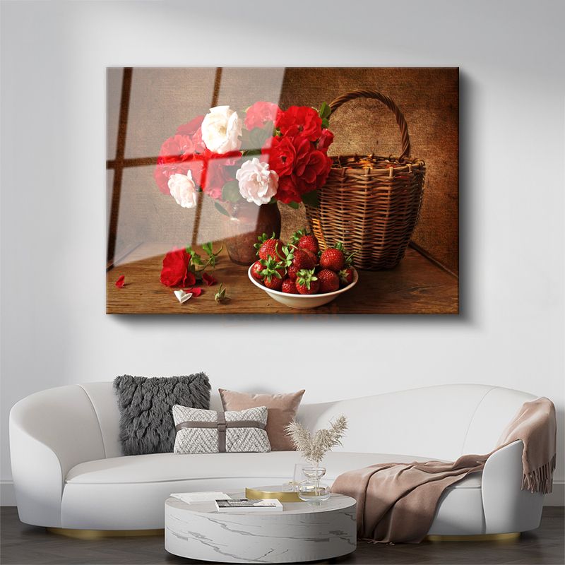 Kırmızı Beyaz Güller - Hasır Sepetli Natürmort Cam Tablo