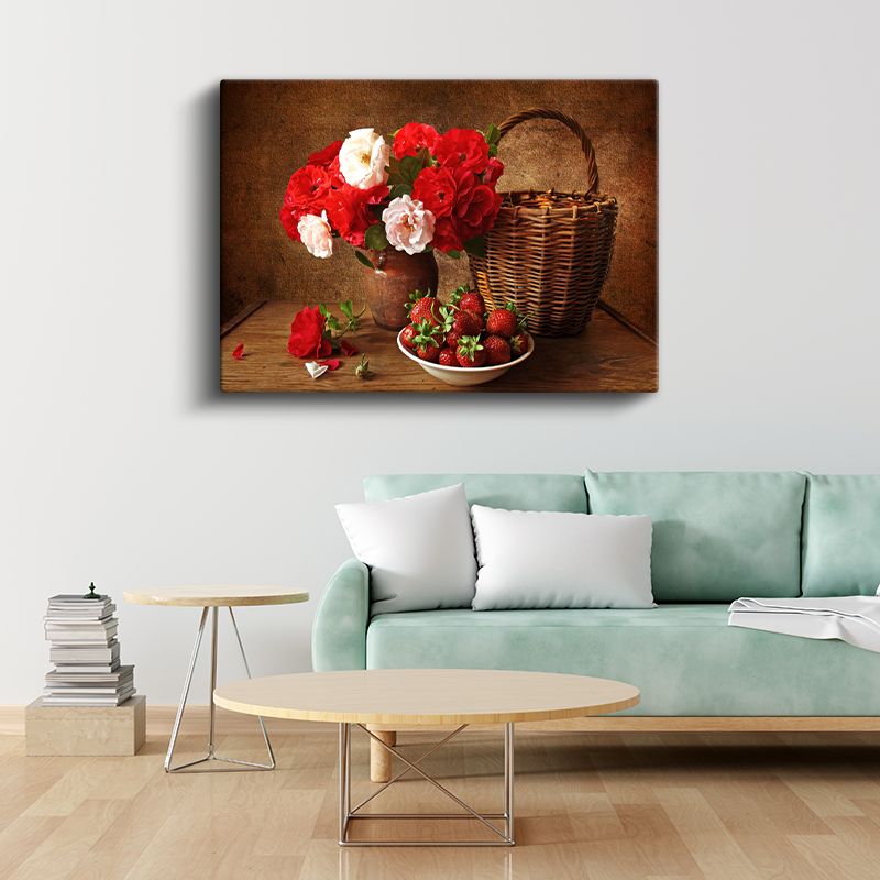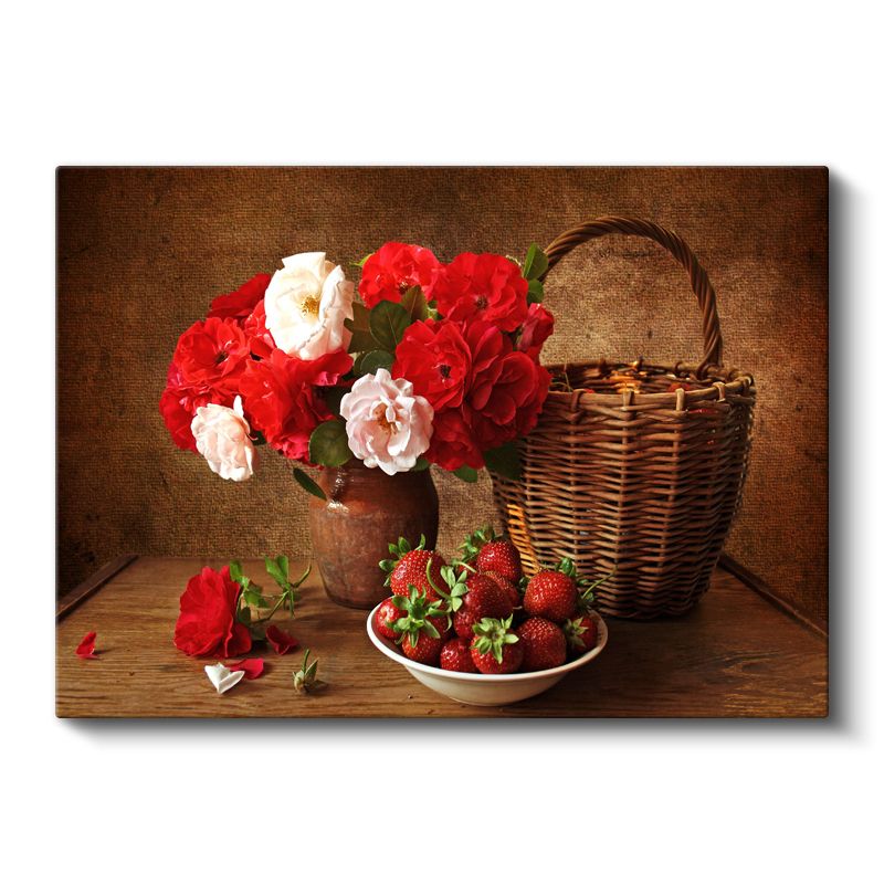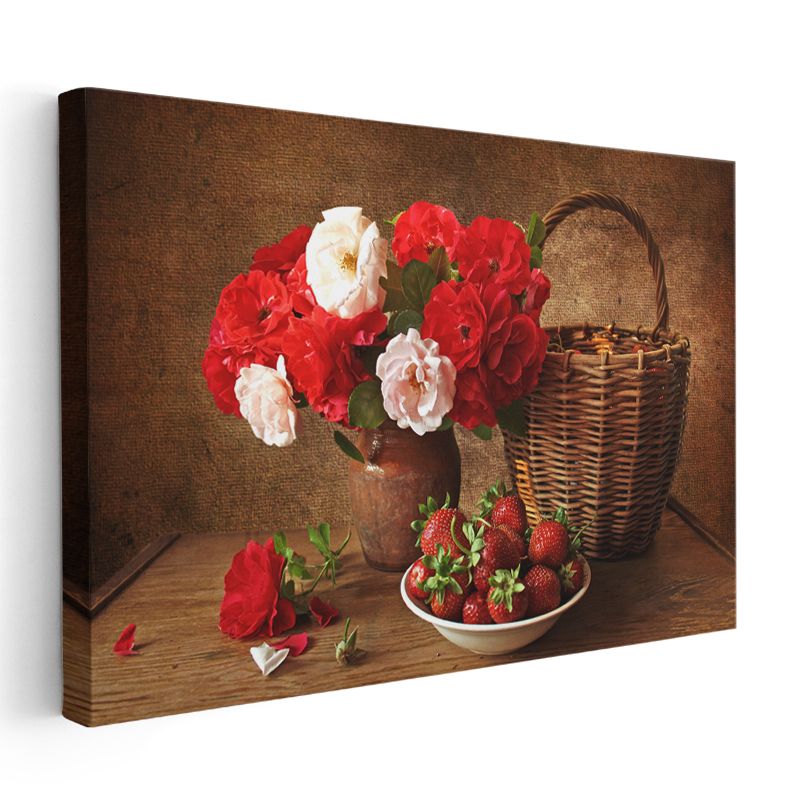 Kırmızı Beyaz Güller - Hasır Sepetli Natürmort Kanvas Tablo