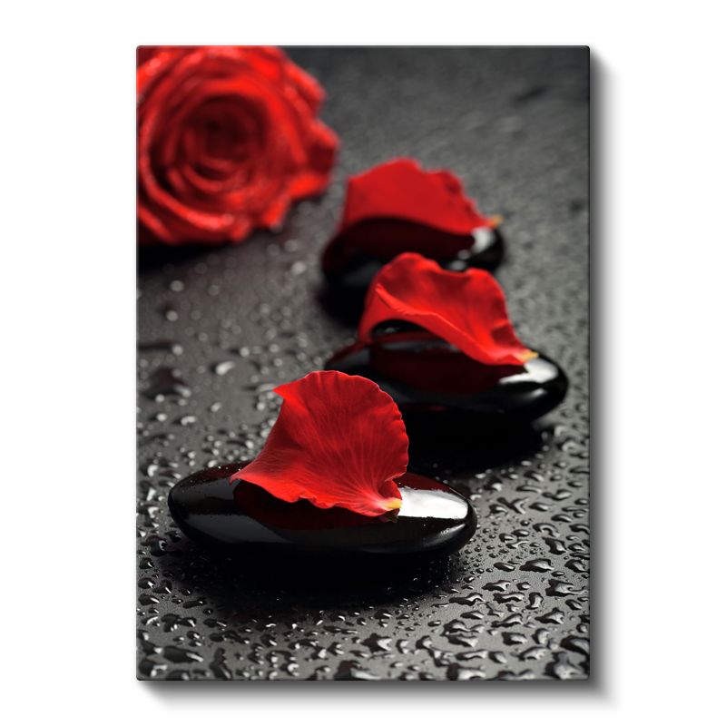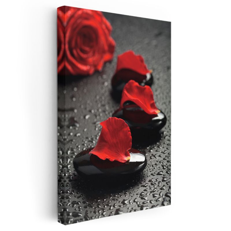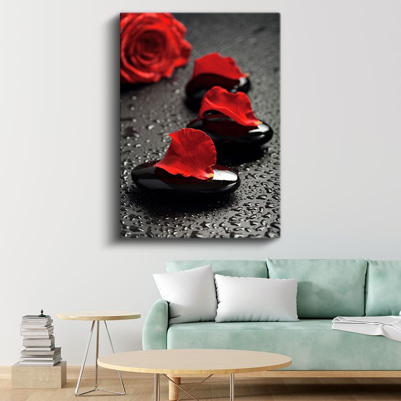 Kırmızı Gül Yaprakları - Siyah Taşlar Üzerinde Dramatik Kompozisyon Kanvas Tablo