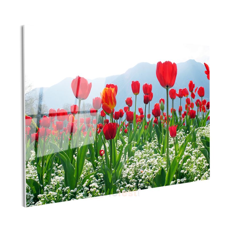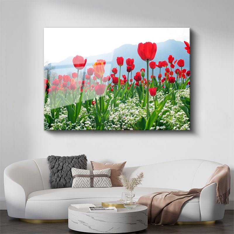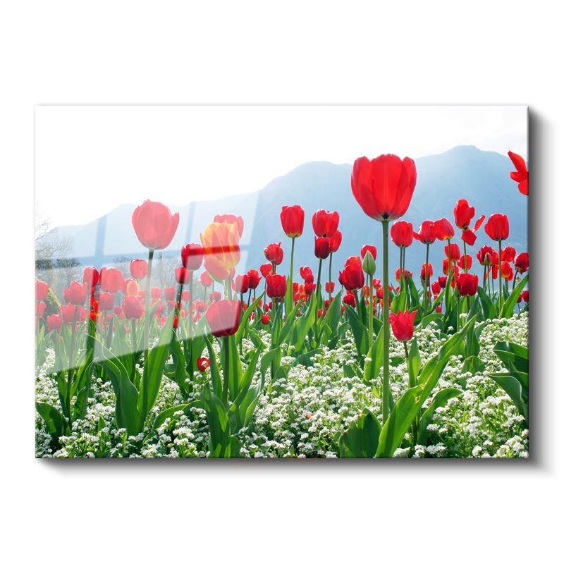 Kırmızı Laleler - Beyaz Çiçeklerle Dağ Manzarası Cam Tablo