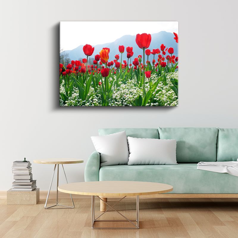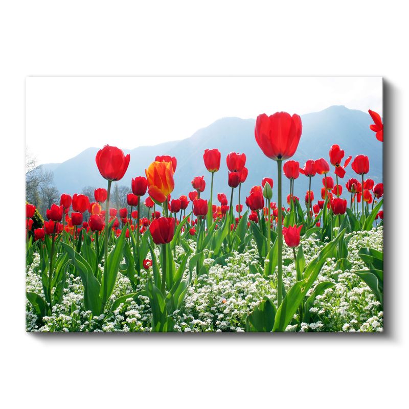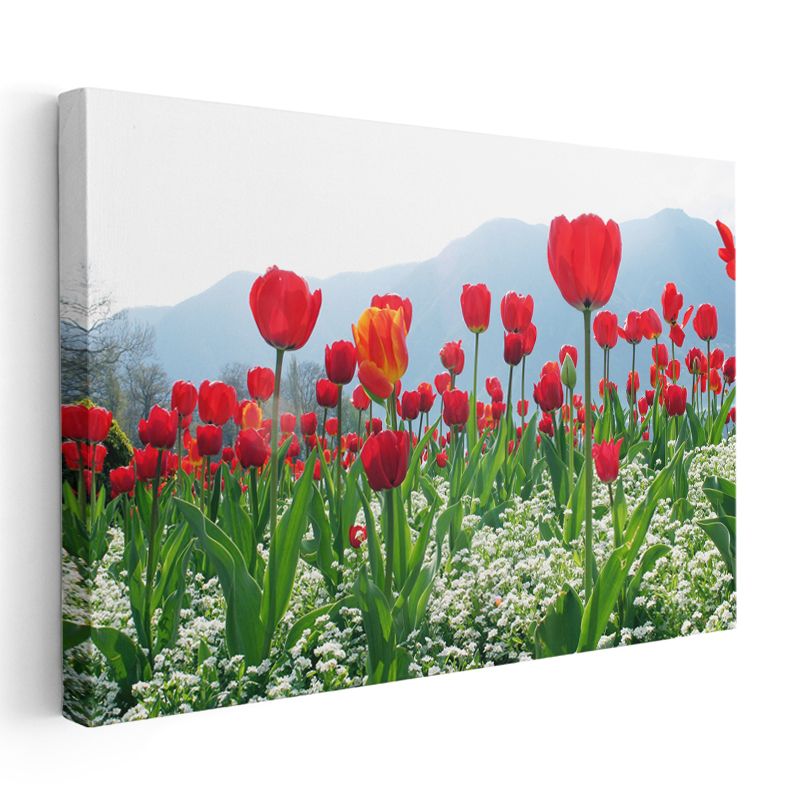 Kırmızı Laleler - Beyaz Çiçeklerle Dağ Manzarası Kanvas Tablo