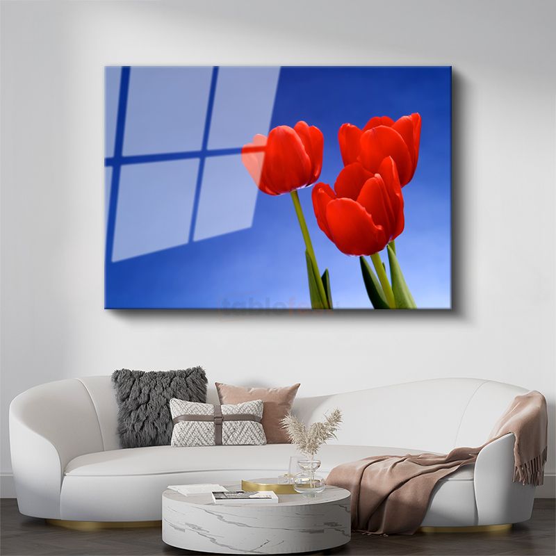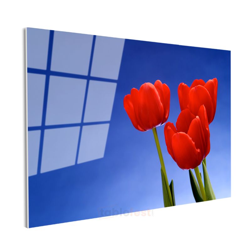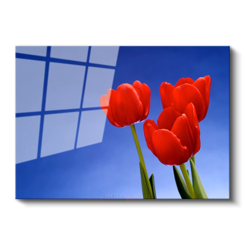 Kırmızı Laleler - Mavi Gökyüzü Altında Bahar Çiçekleri Cam Tablo
