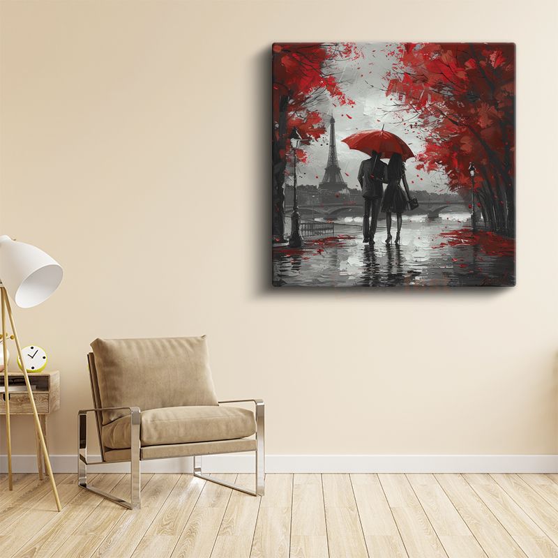 Kırmızı Şemsiye - Eyfel Manzaralı Romantik Buluşma Kanvas Tablo