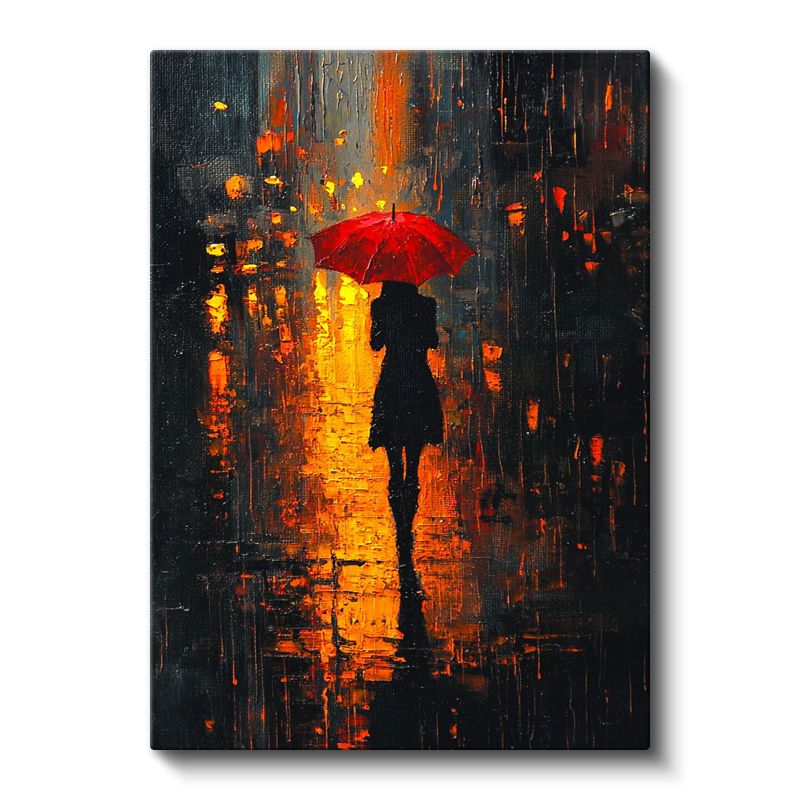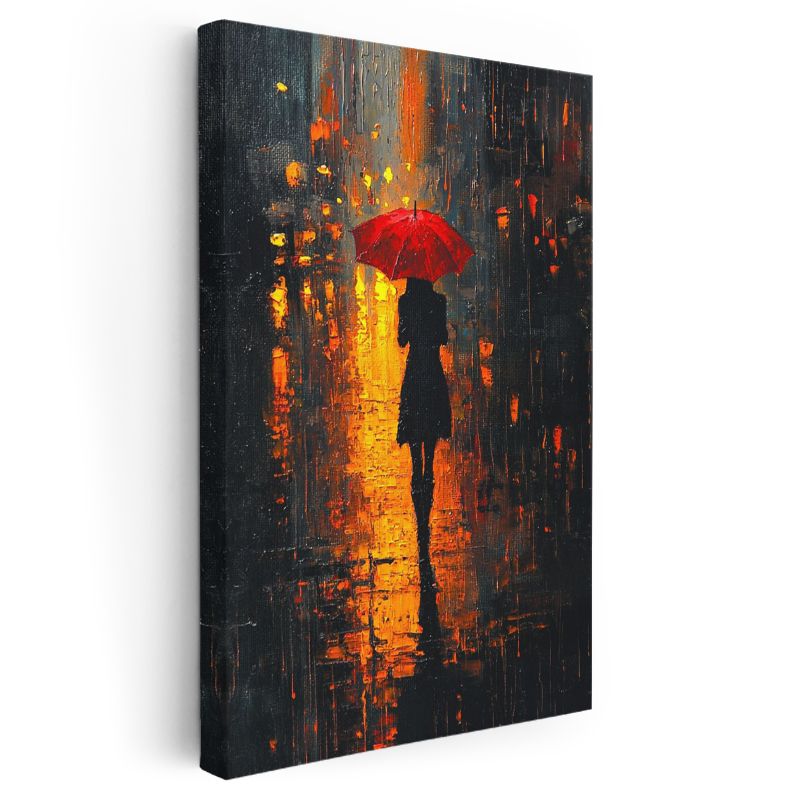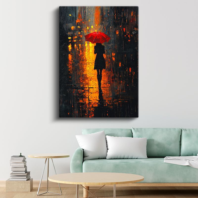Kırmızı Şemsiye - Gece Işıklarında Yalnız Silüet Kanvas Tablo