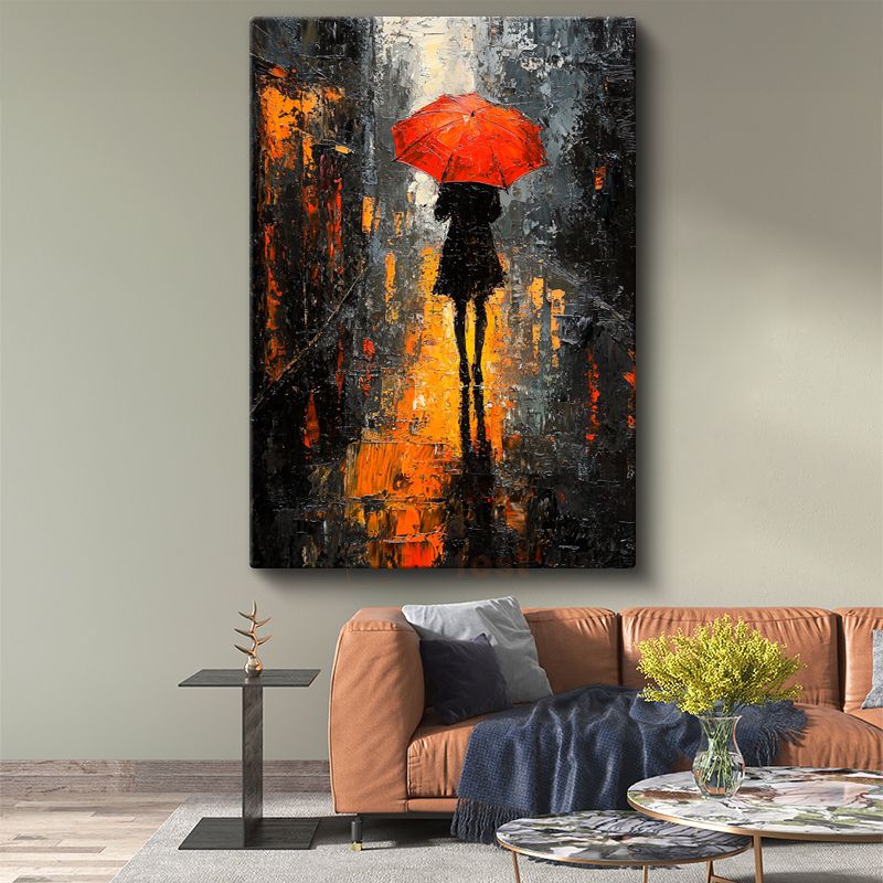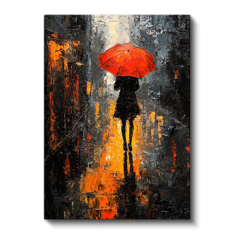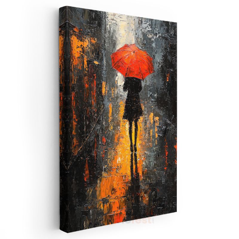 Kırmızı Şemsiye - Yağmurlu Sokak Silueti Kanvas Tablo