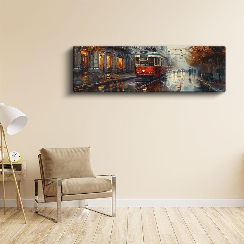 Kırmızı Tramvay - Yağmurlu Cadde Manzarası Kanvas Tablo