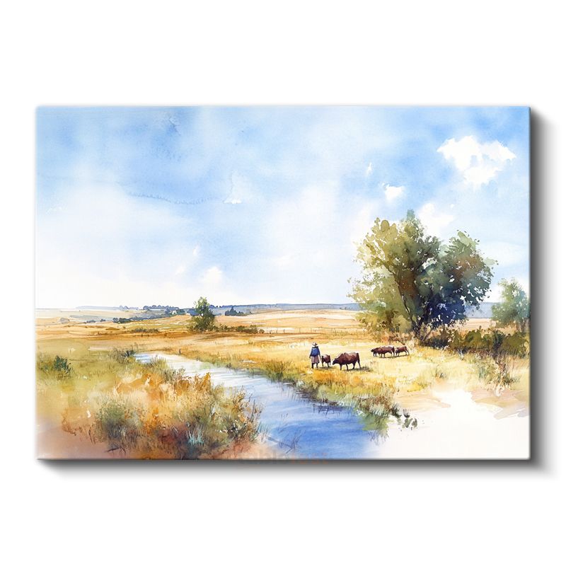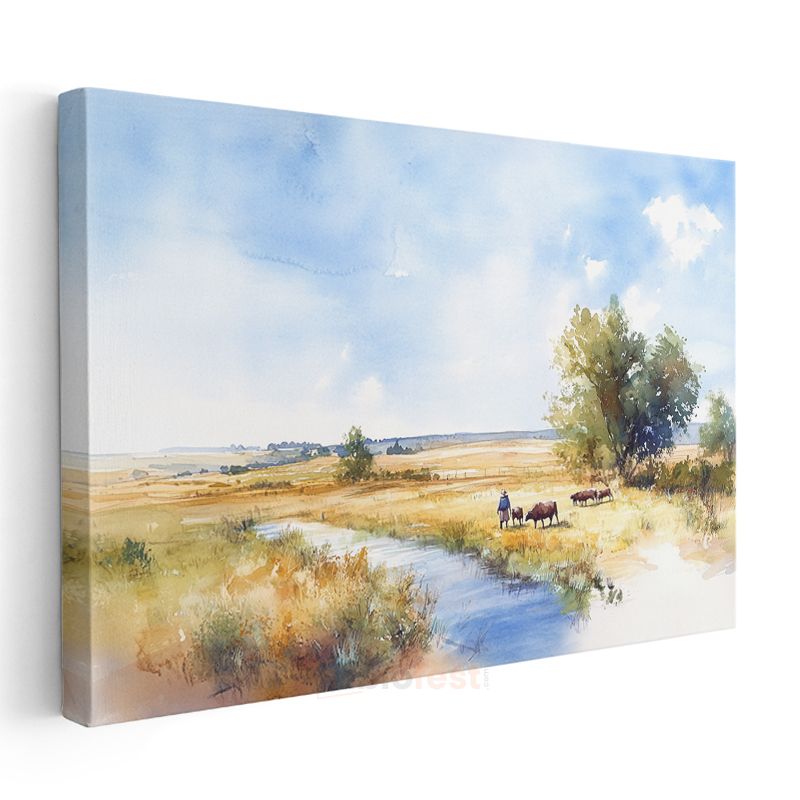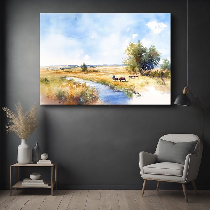 Kırsal Manzara - Nehir Kenarında Huzurlu Bir Gün Kanvas Tablo
