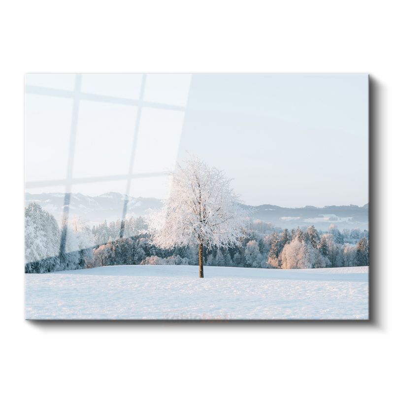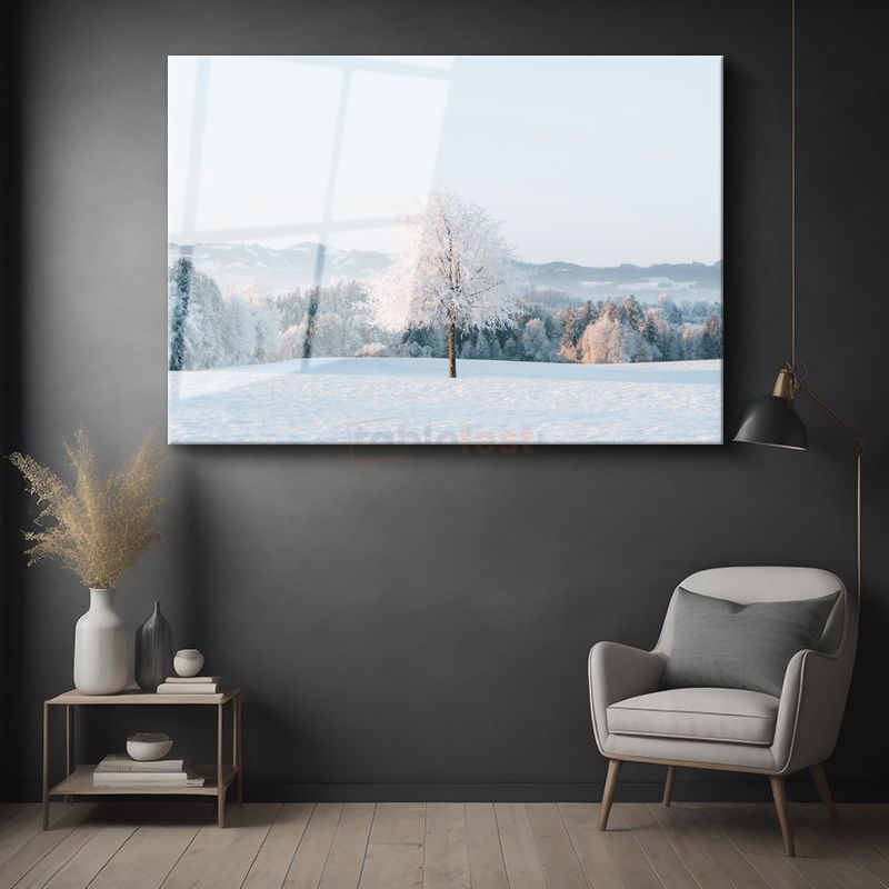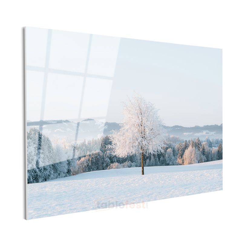Kış Beyazı - Karlı Manzarada Yalnız Ağaç Silüeti Cam Tablo