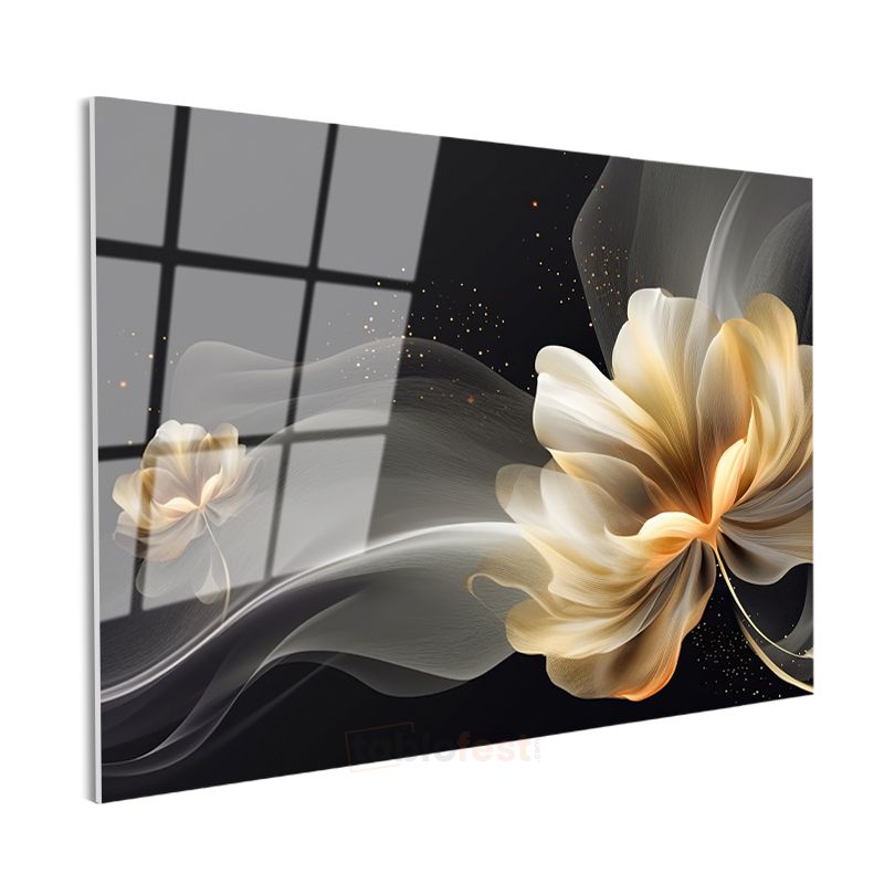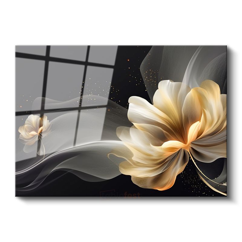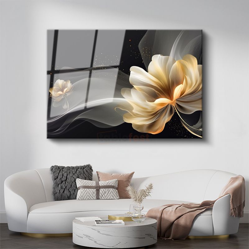 Kış Çiçekleri - Gri Fonda Beyaz Çiçek Dalları Cam Tablo