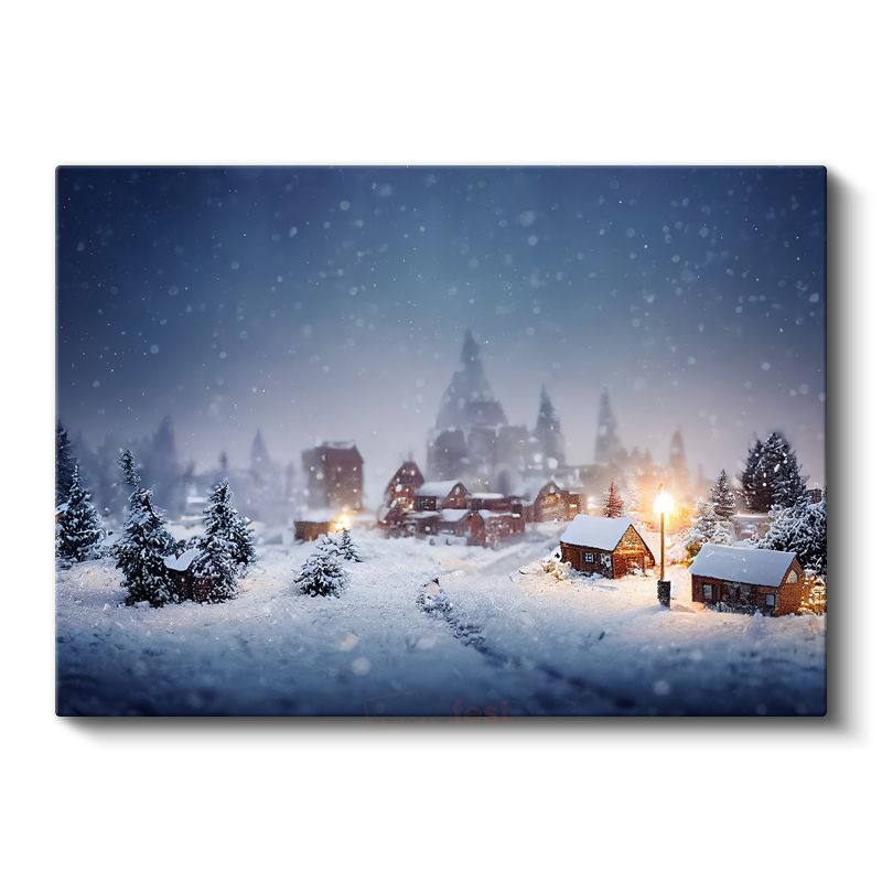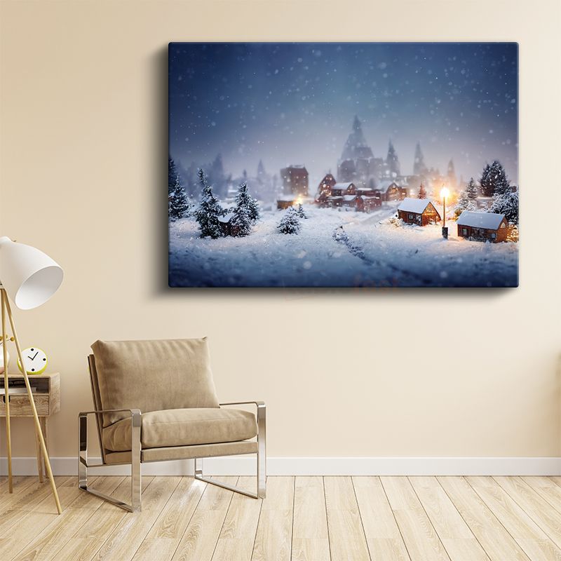 Kış Köyü - Karlı Gecede Işıklar Kanvas Tablo