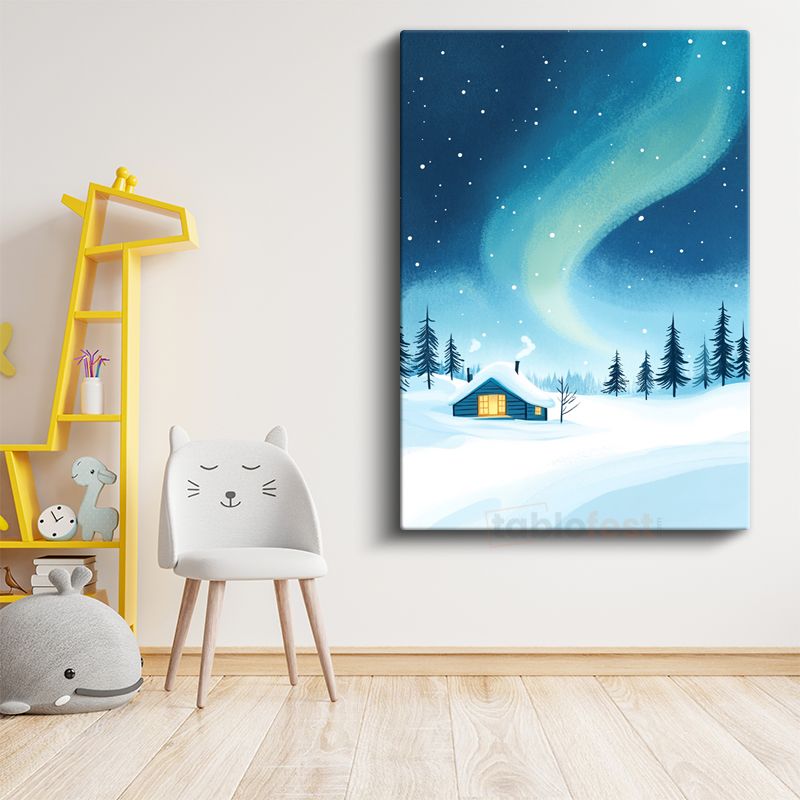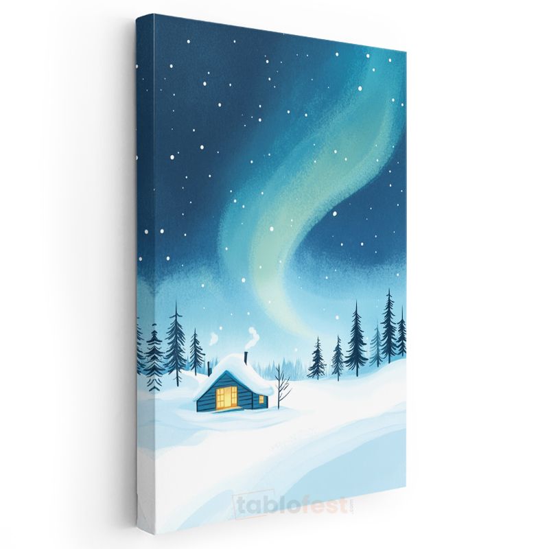 Kış Kulübesi - Kuzey Işıkları ve Karlı Orman Kanvas Tablo