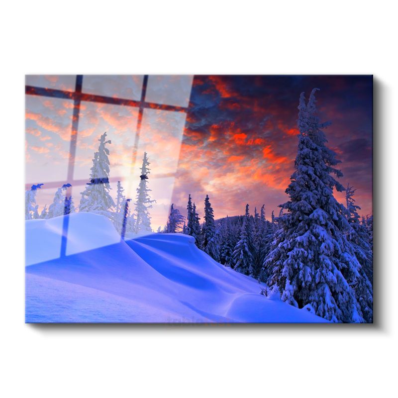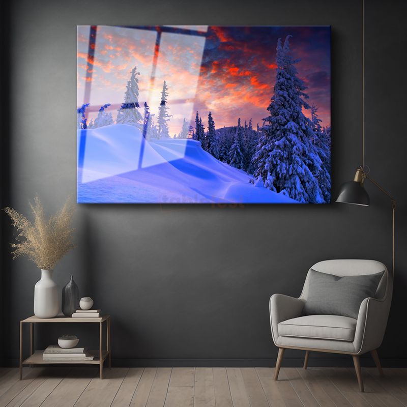 Kış Manzarası - Kızıl Gökyüzü Altında Karlı Çamlar Cam Tablo