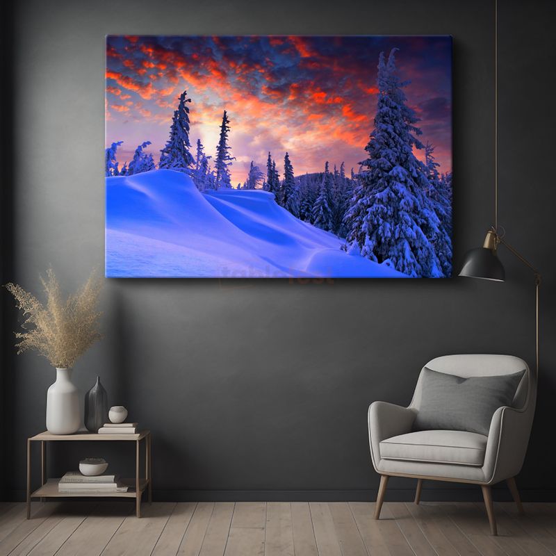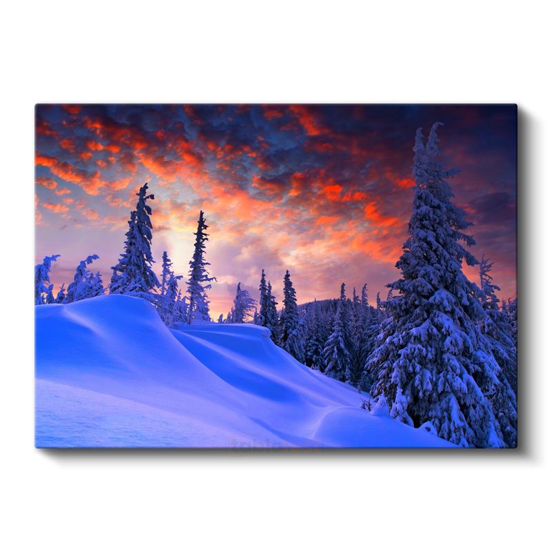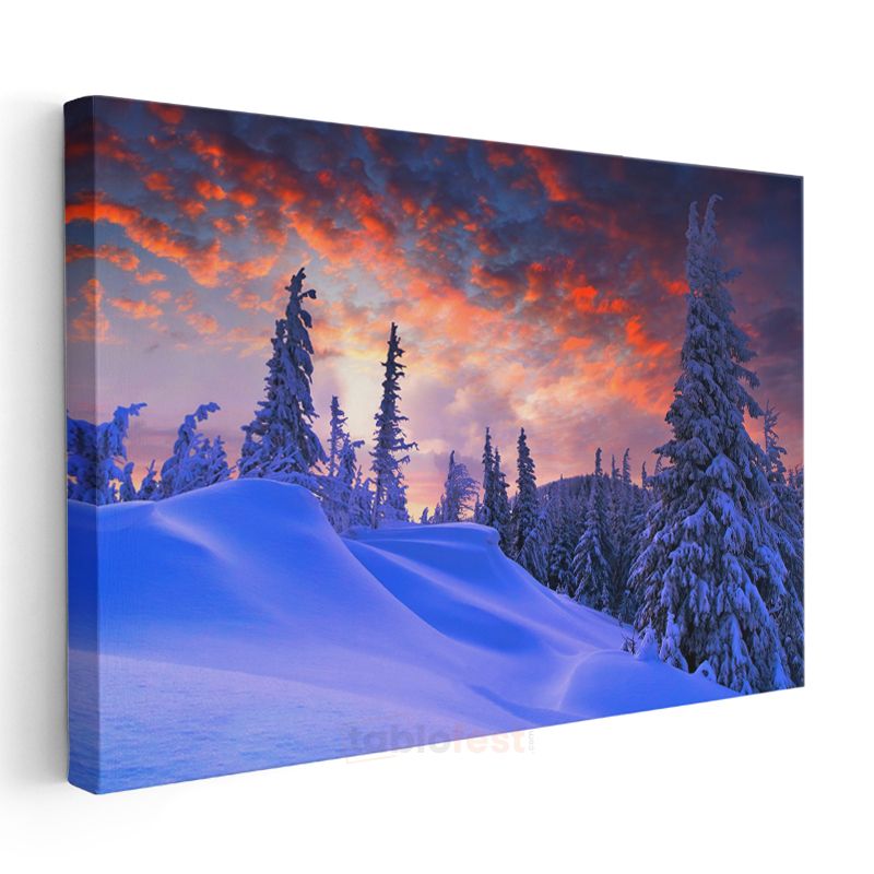 Kış Manzarası - Kızıl Gökyüzü Altında Karlı Çamlar Kanvas Tablo