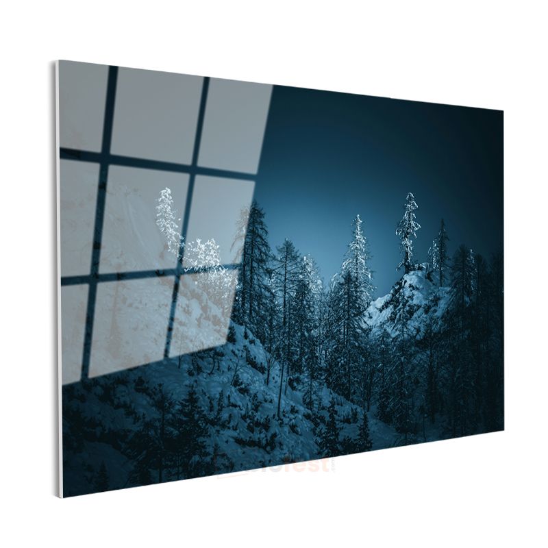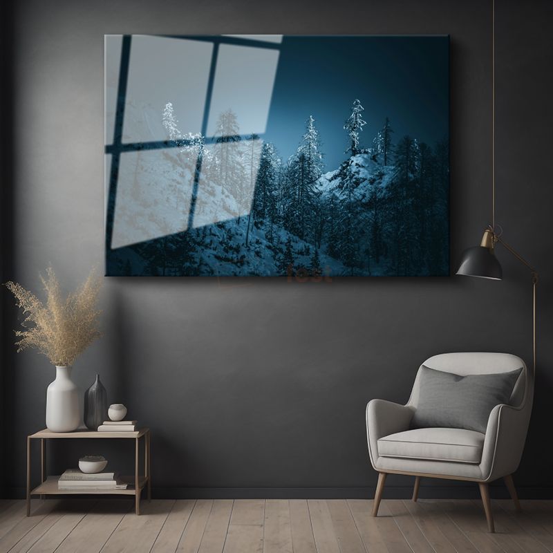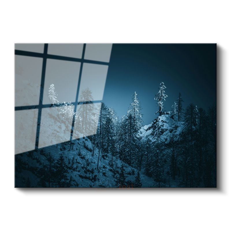 Kış Ormanı - Gecenin Maviliğinde Karlı Çamlar Cam Tablo