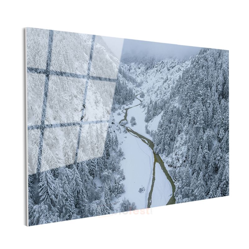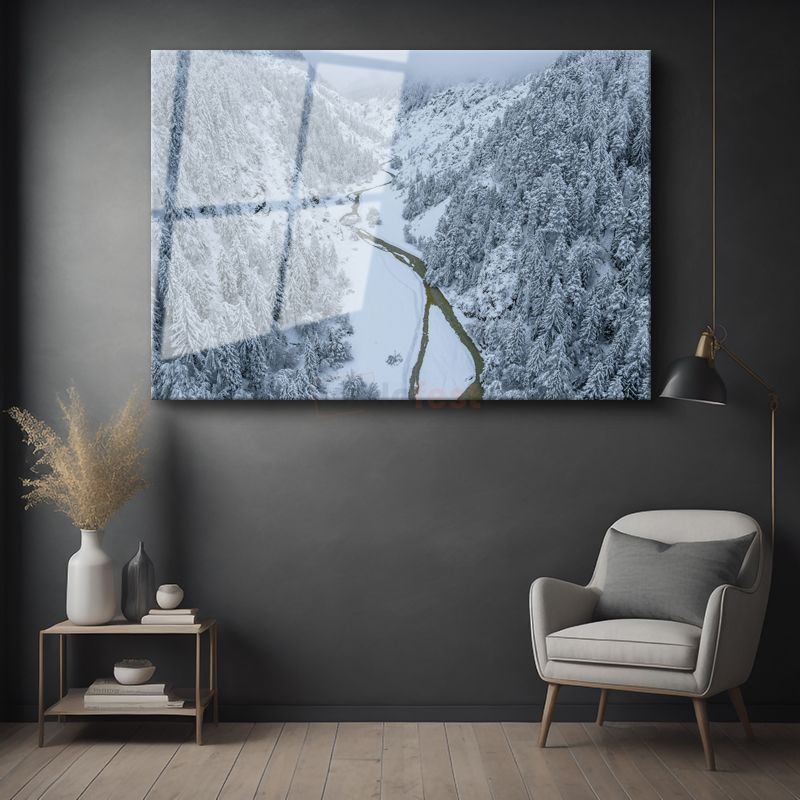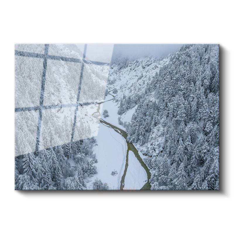 Kış Vadisi - Kar Altındaki Çam Ormanları Arasında Akan Dere Cam Tablo
