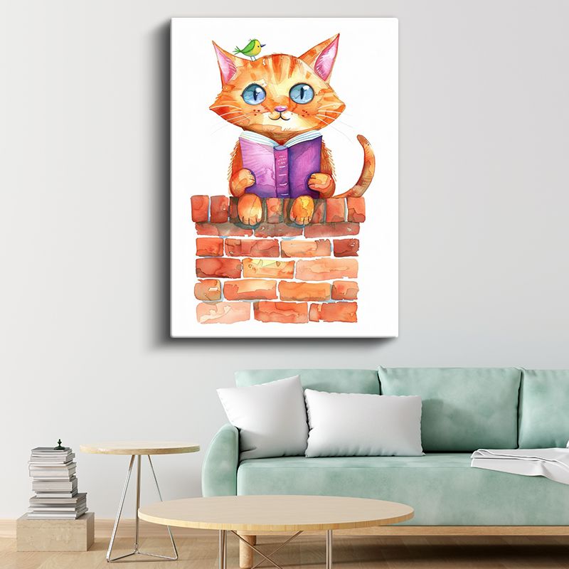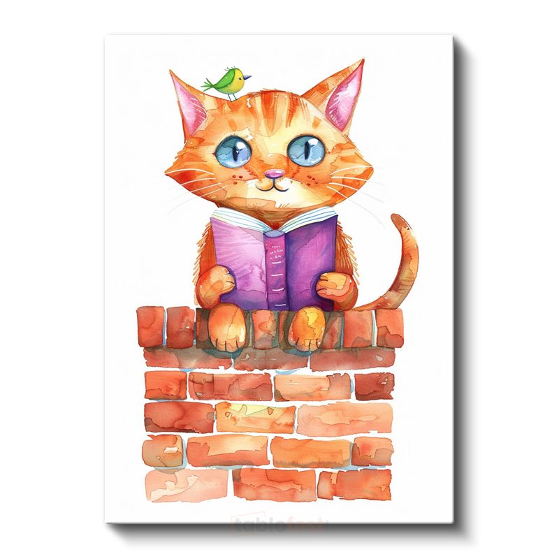 Kitapsever Kedi - Minik Kuşla Okuma Keyfi Kanvas Tablo
