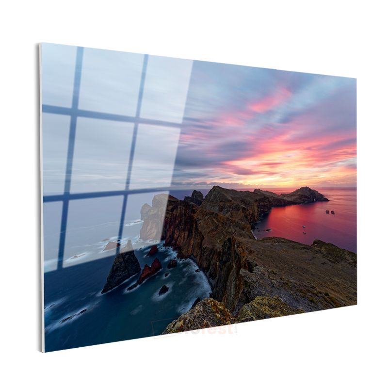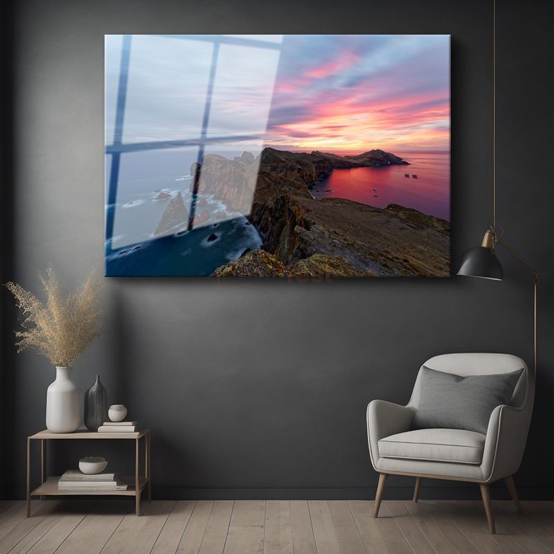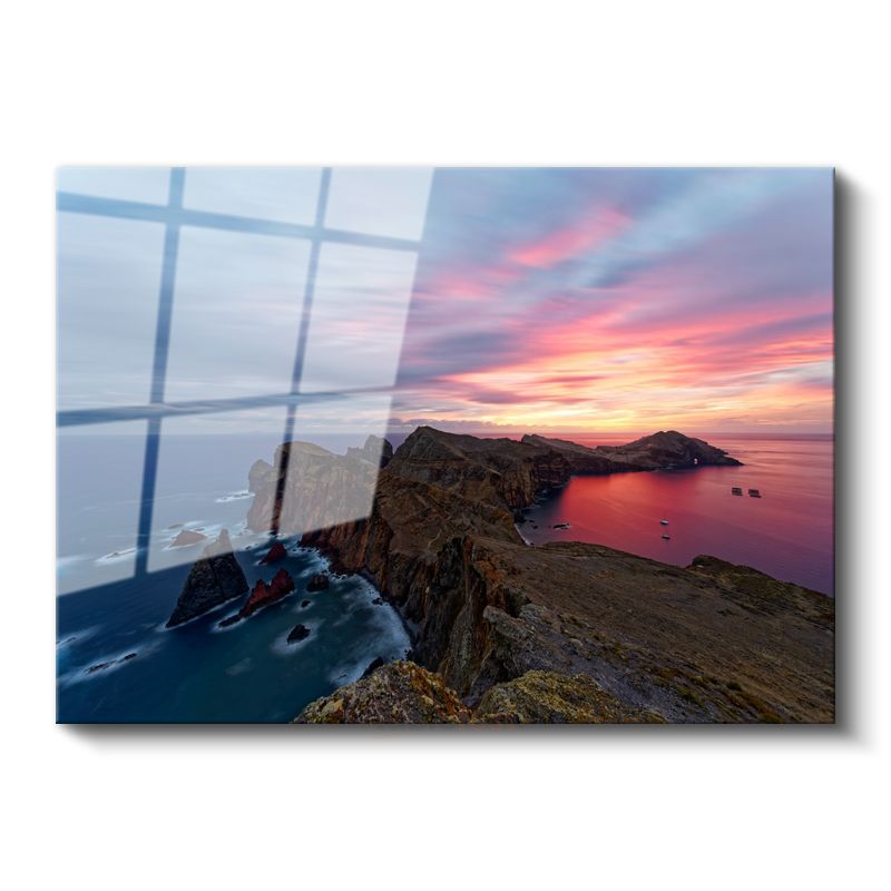 Kıyı Kayalıkları - Alev Renkli Gün Batımında Okyanus Manzarası Cam Tablo