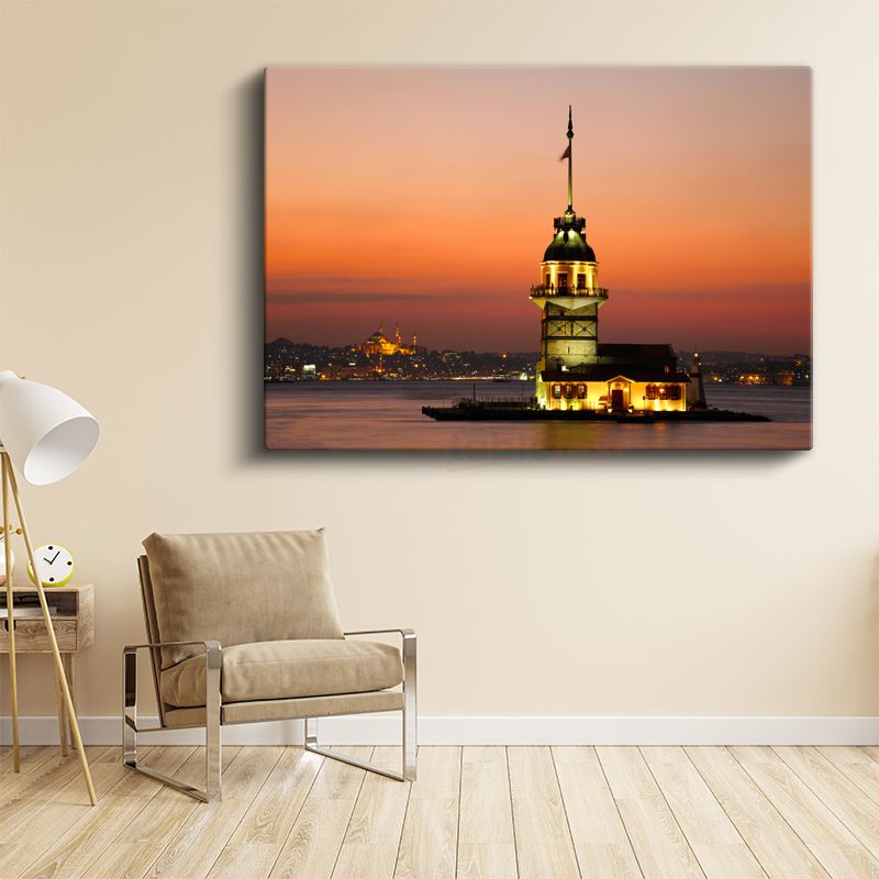 Kız Kulesi - Gün Batımında Işıklı Deniz Feneri Kanvas Tablo