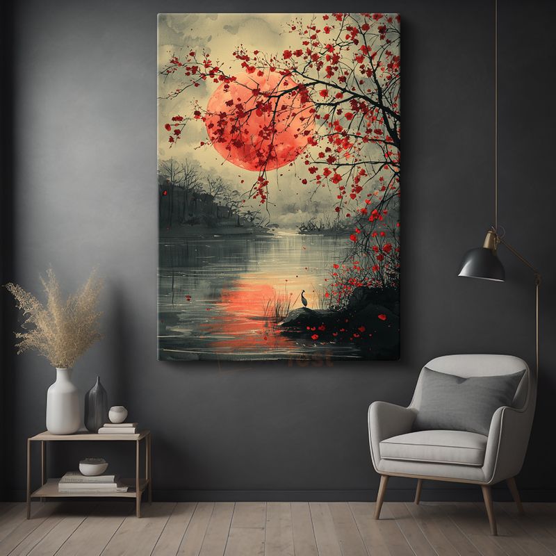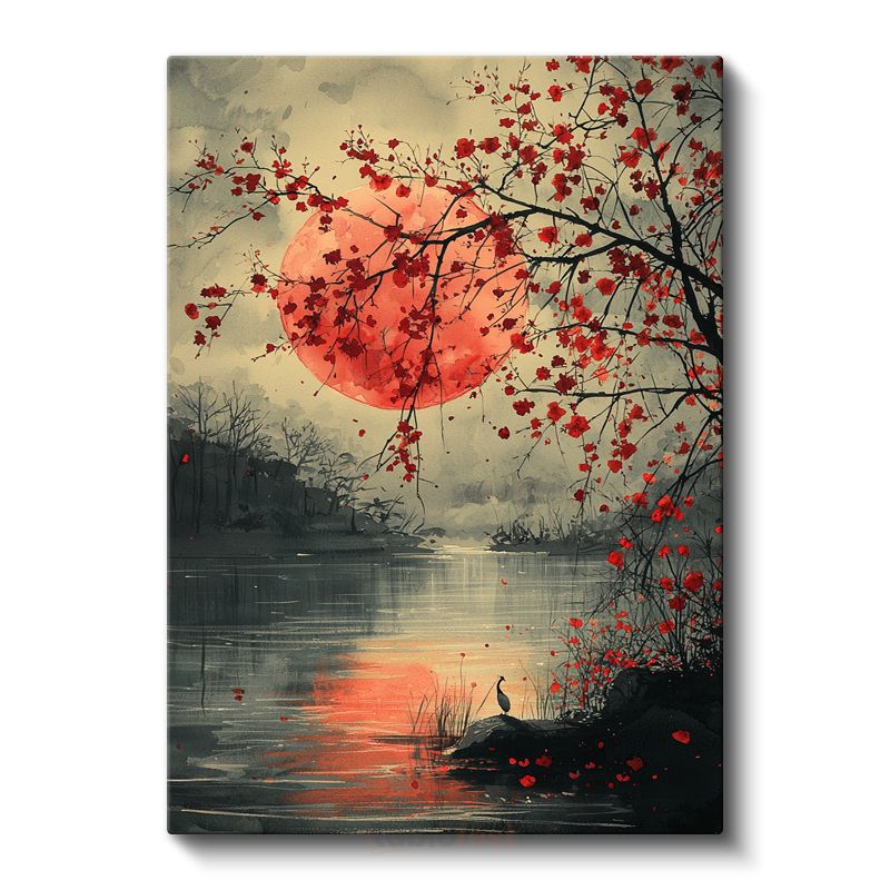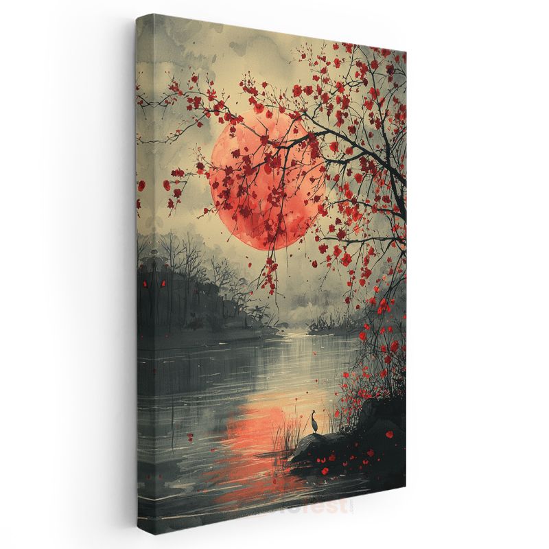 Kızıl Ay - Çiçekli Dal ve Göl Manzarası Kanvas Tablo