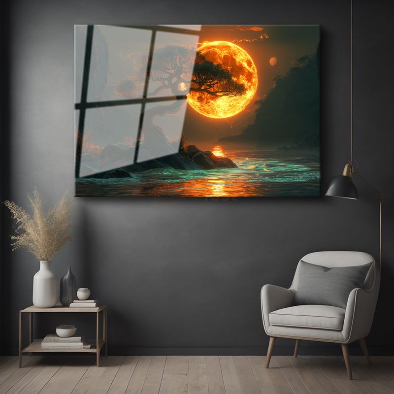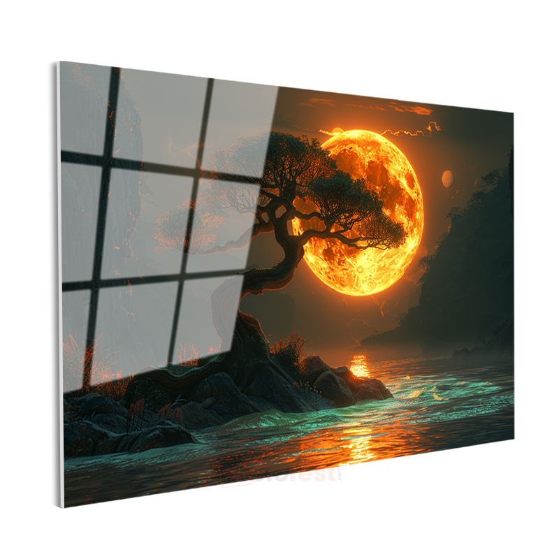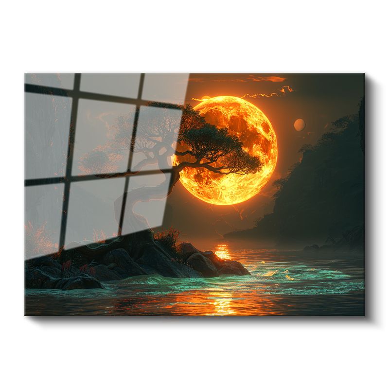 Kızıl Dolunay - Mistik Ağaç Silüeti Cam Tablo