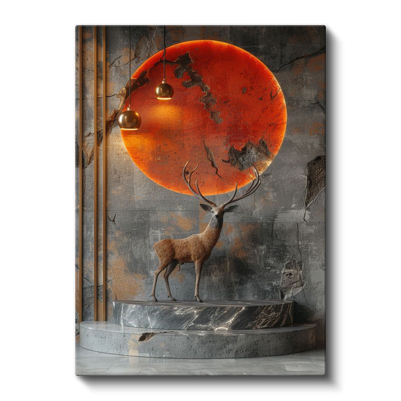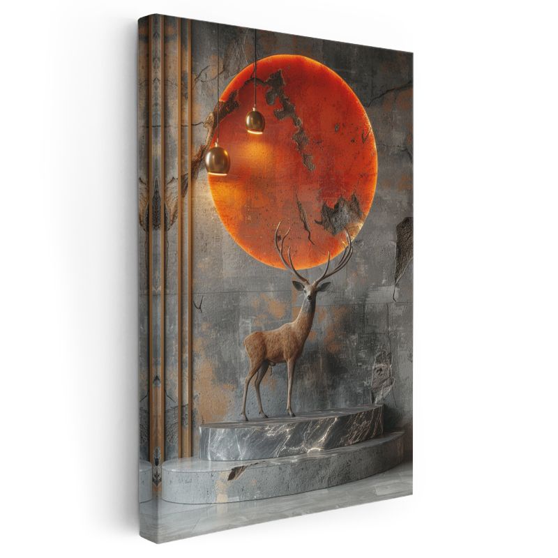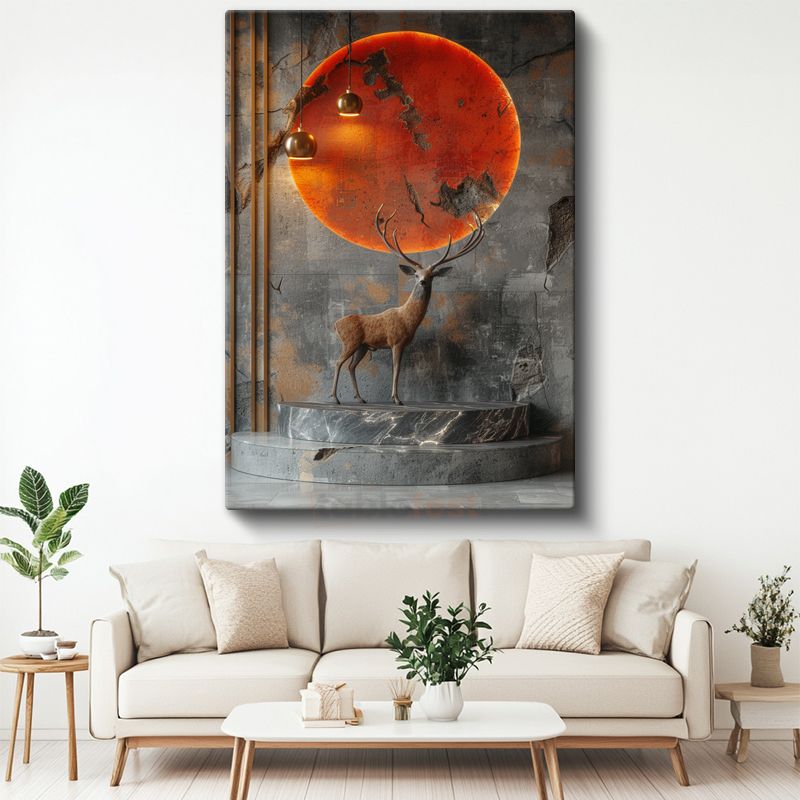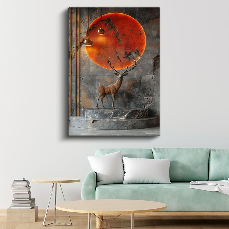 Kızıl Geyik - Turuncu Ay Işığında Asil Duruş Kanvas Tablo