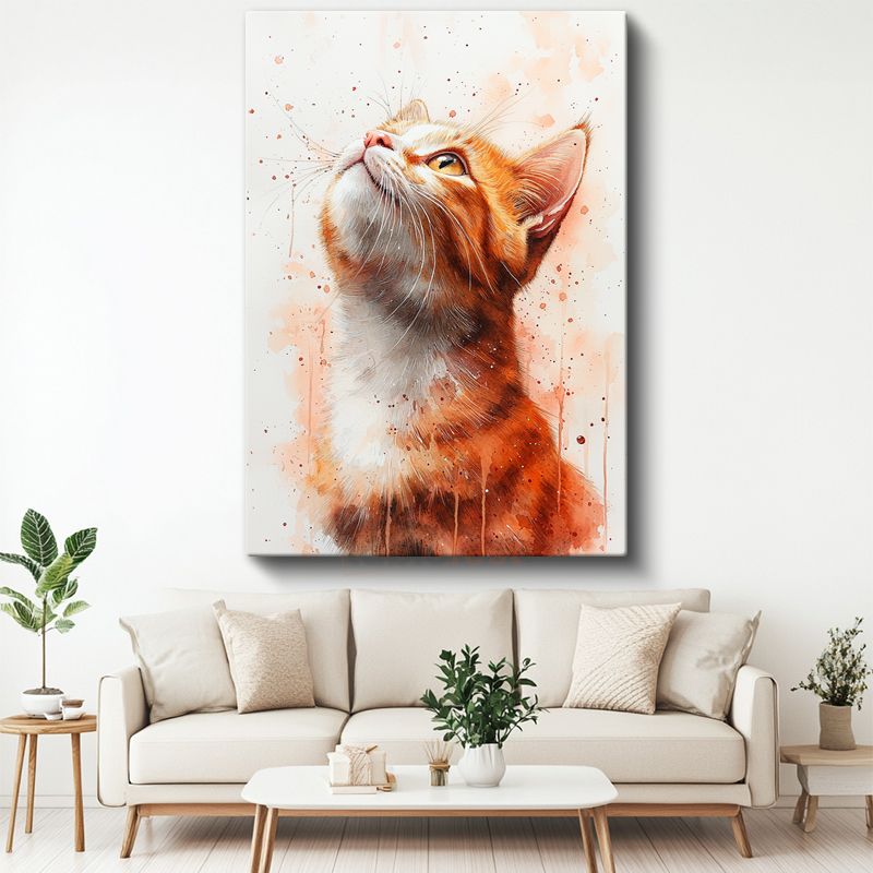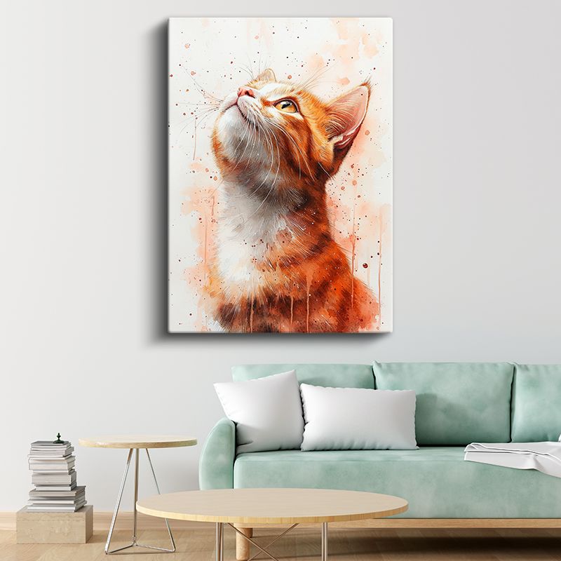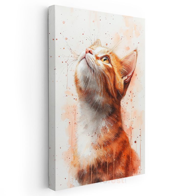 Kızıl Kedi - Suluboya Efektli Yukarı Bakan Portre Kanvas Tablo