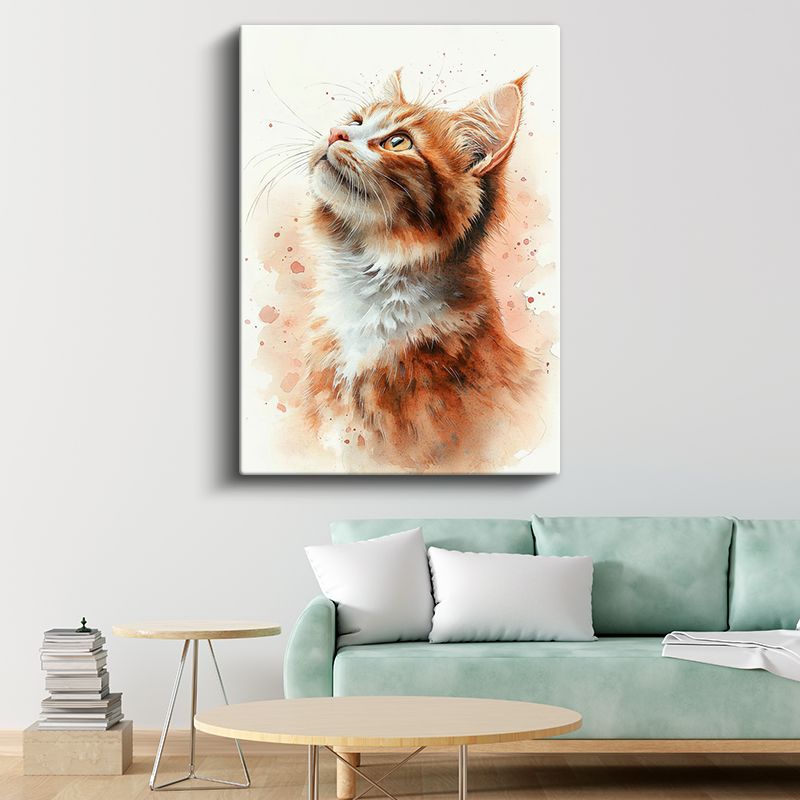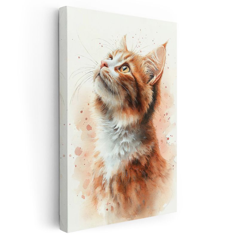 Kızıl Kedi - Suluboya Efektli Yukarı Bakan Portre Kanvas Tablo