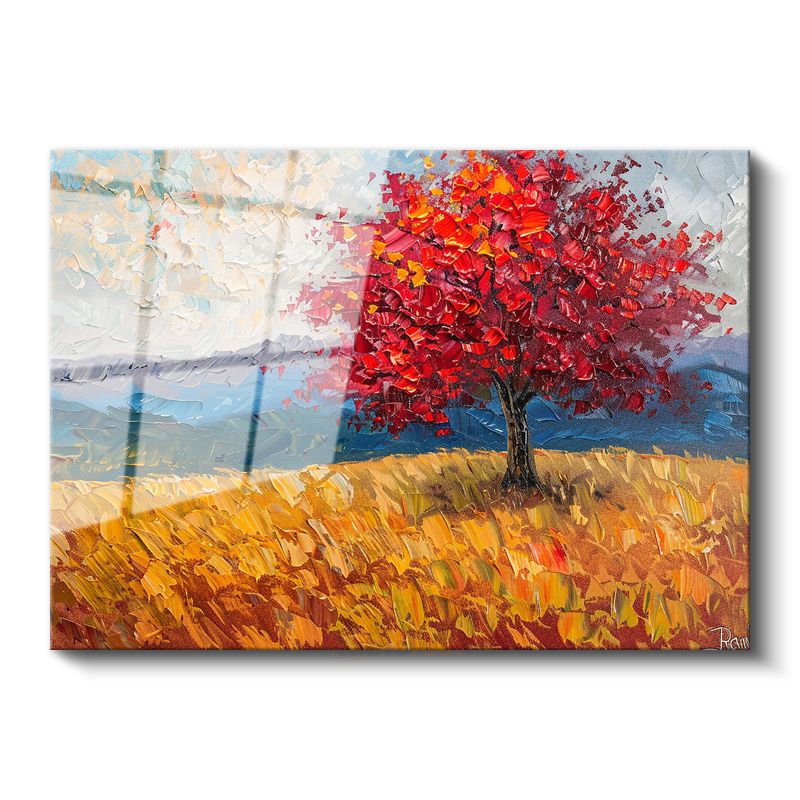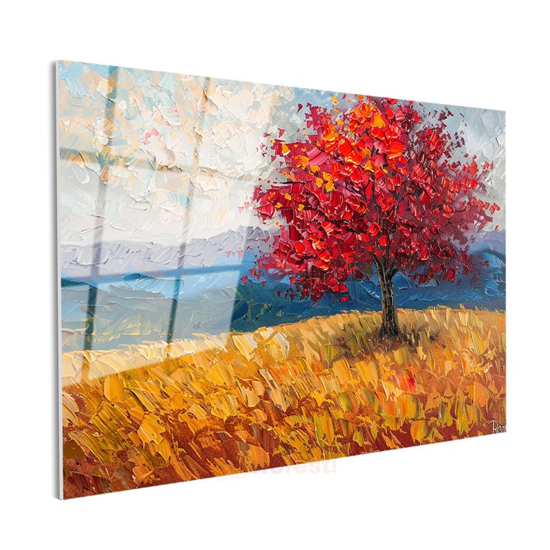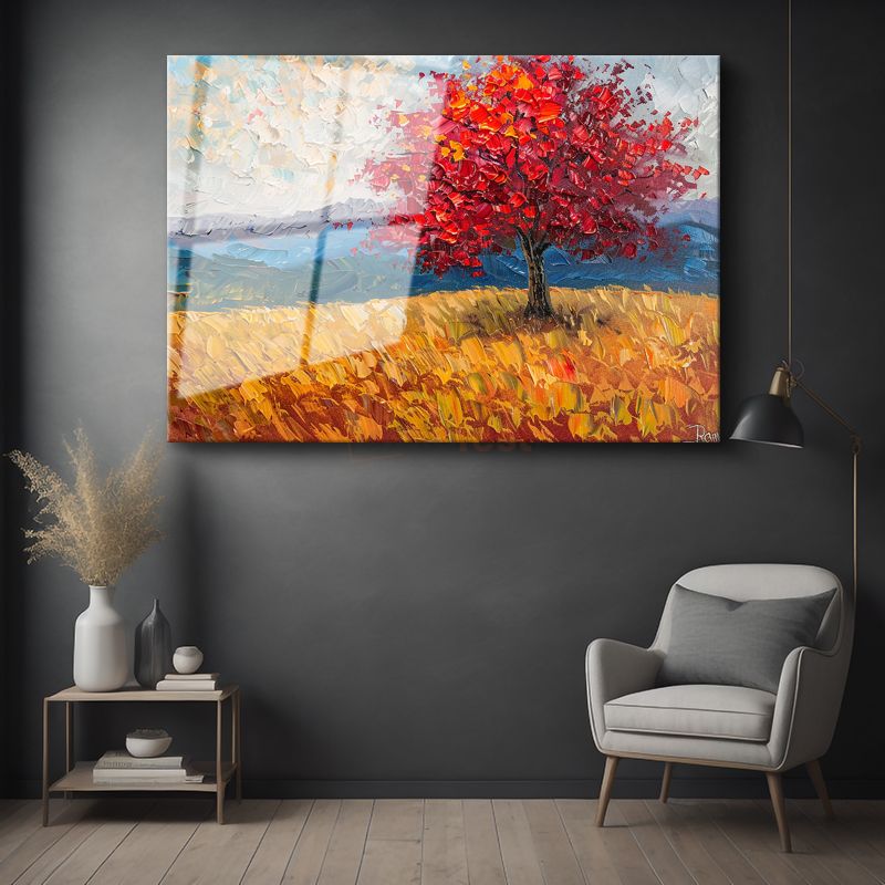 Kızıl Sonbahar Ağacı - Altın Tarla Manzarası Cam Tablo