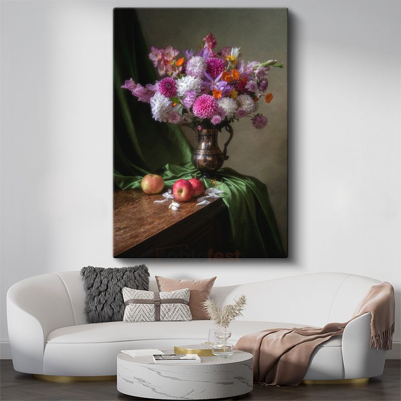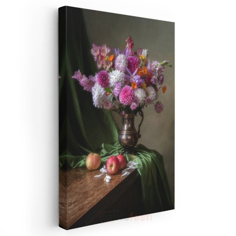Klasik Çiçek Natürmortu - Bronz Vazoda Krizantem Buketi Kanvas Tablo