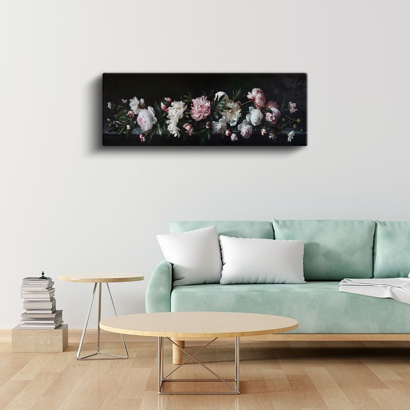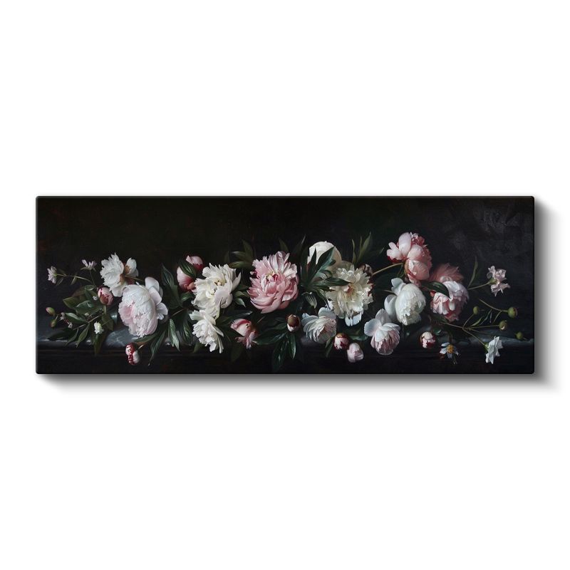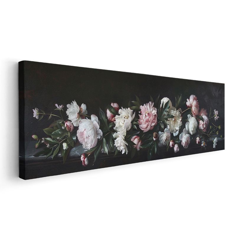 Klasik Şakayıklar - Siyah Zeminde Pembe ve Beyaz Çiçekler Natürmort Kanvas Tablo