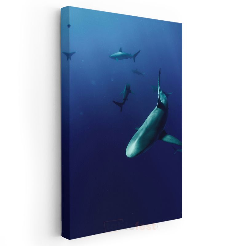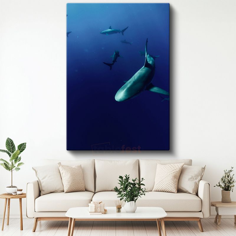 Köpekbalığı Sürüsü - Derin Mavide Yüzen Avcılar Kanvas Tablo