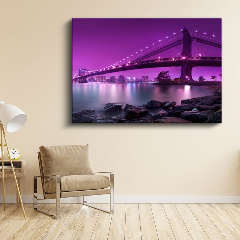 Köprü Silüeti - Mor Işıklar Altında Kanvas Tablo