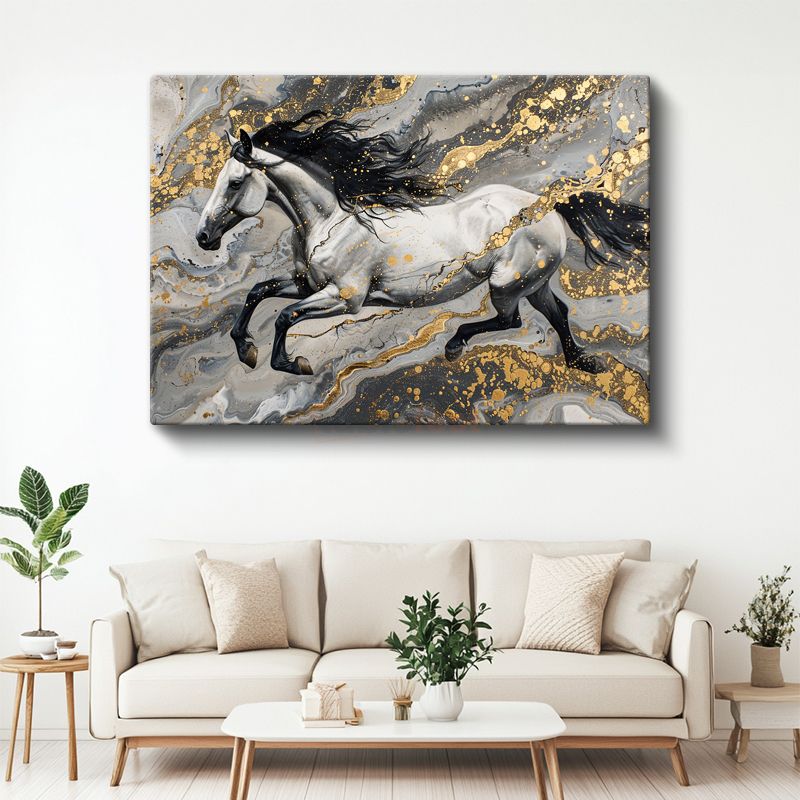 Koşan Beyaz At - Gri ve Altın Tonlarında Dinamik Hareket Kanvas Tablo