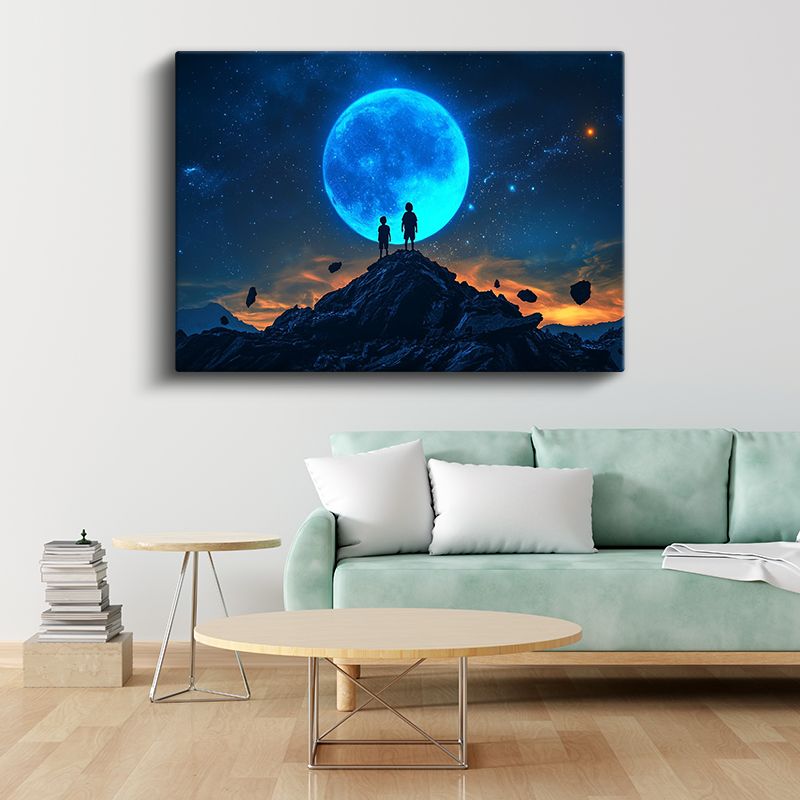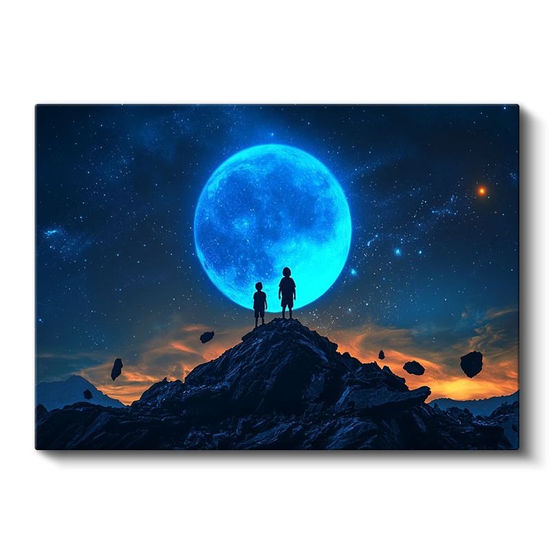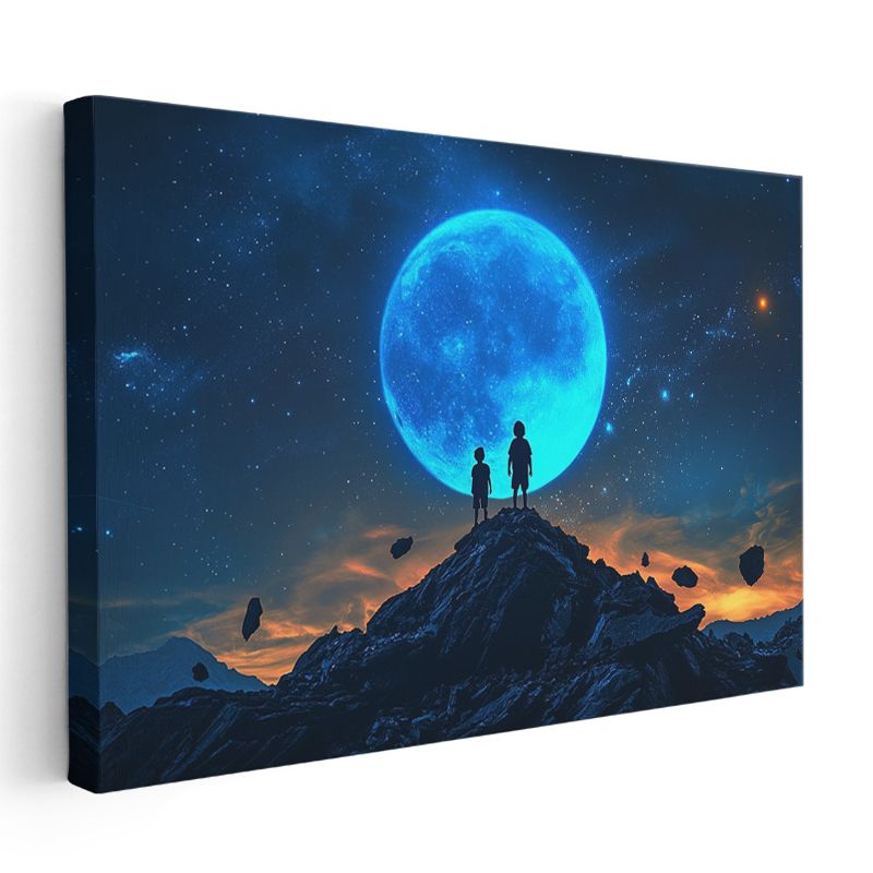 Kozmik Buluşma - Mavi Ayın Büyüsüne Kapılan Çocuklar Kanvas Tablo