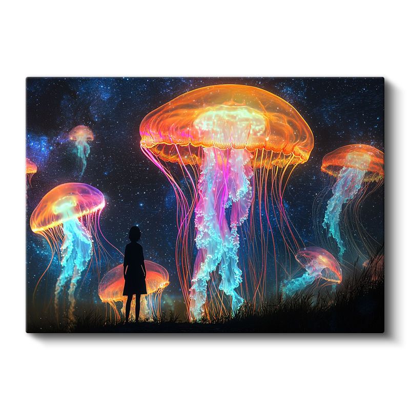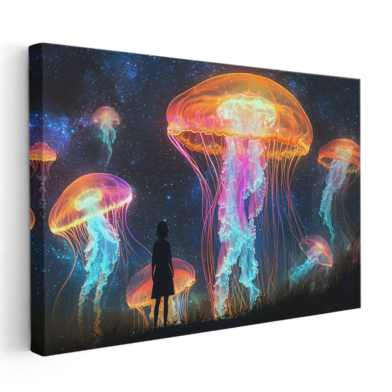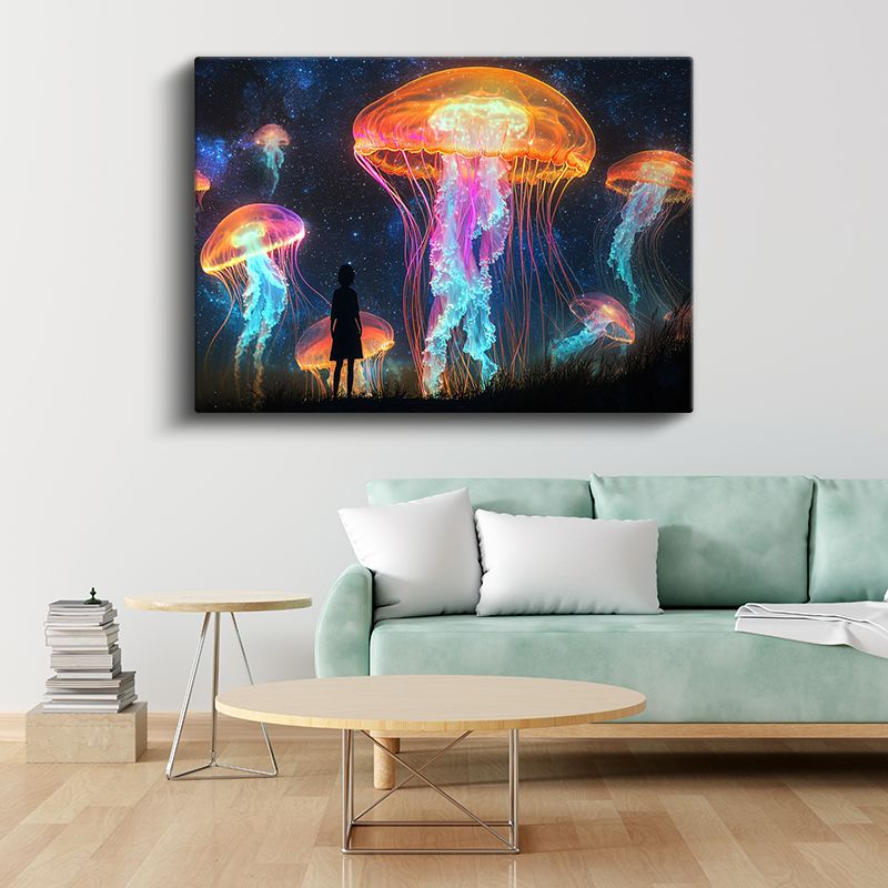 Kozmik Denizaltı - Işıldayan Denizanalarının Dansını İzleyen Yolcu Kanvas Tablo
