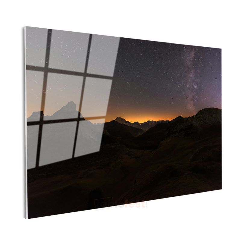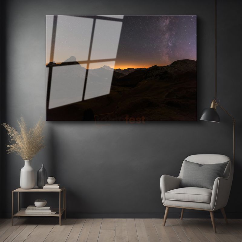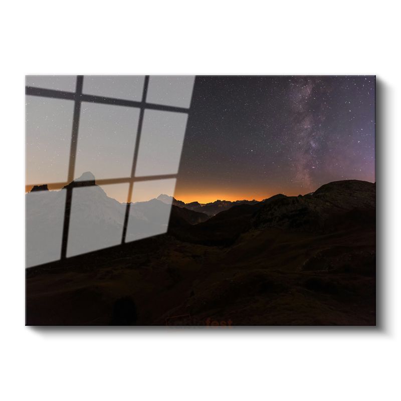 Kozmik Manzara - Dağlar Üzerinde Parıldayan Samanyolu Cam Tablo