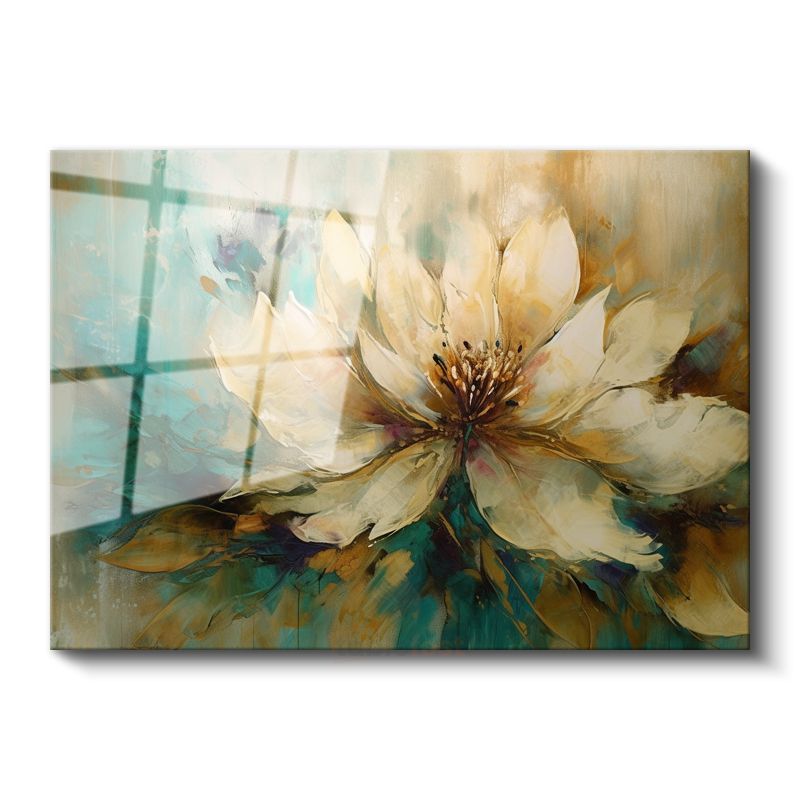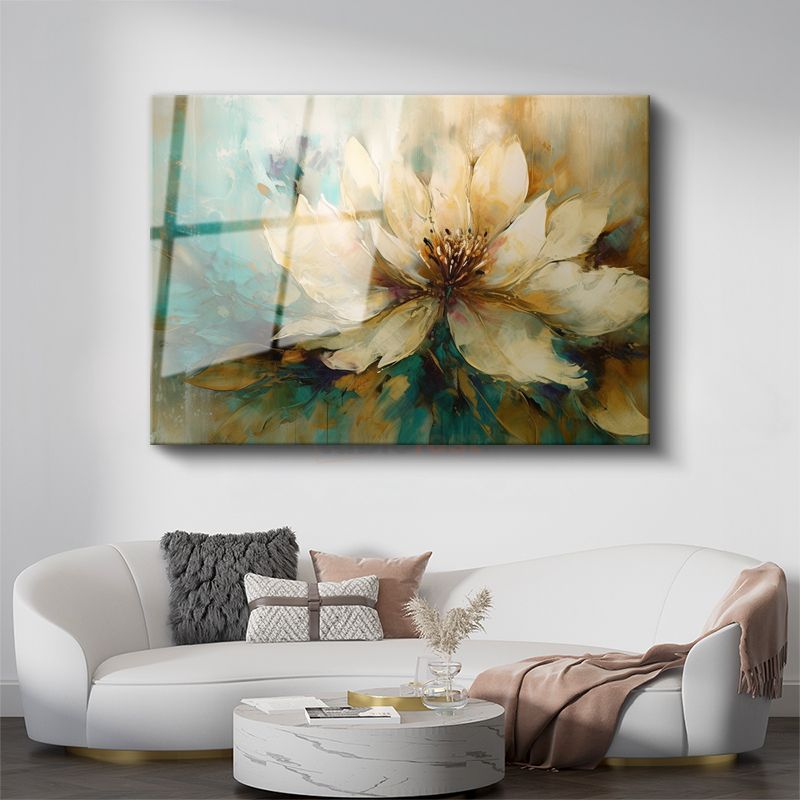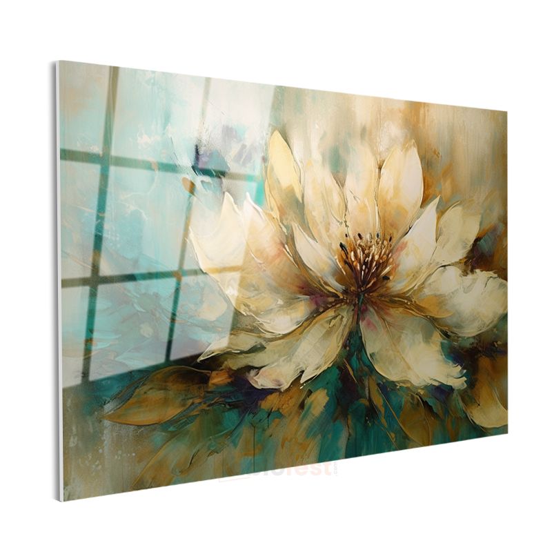 Krem Çiçek - Turkuaz ve Altın Tonlarında Soyut Tasarım Cam Tablo