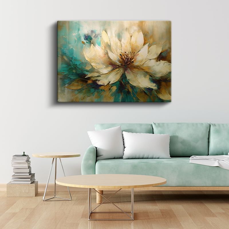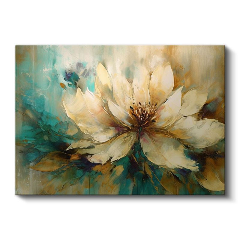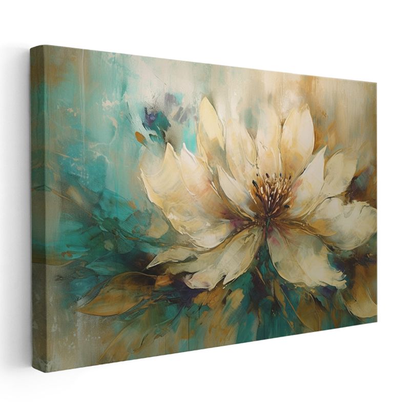 Krem Çiçek - Turkuaz ve Altın Tonlarında Soyut Tasarım Kanvas Tablo