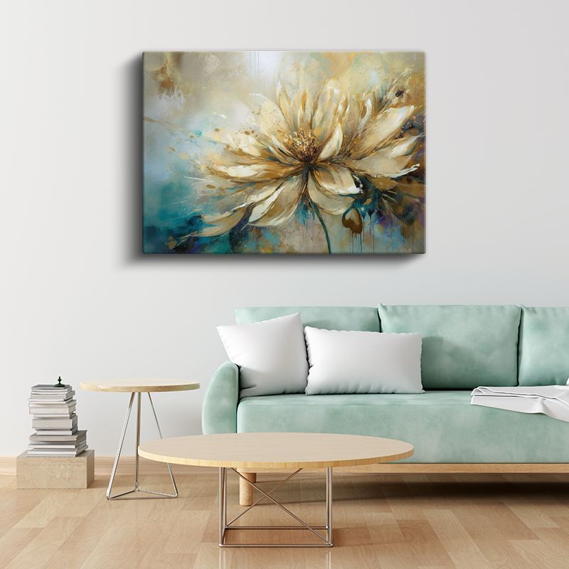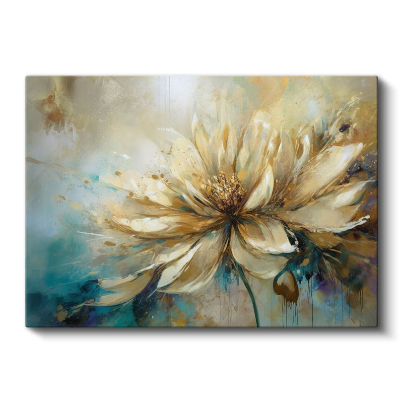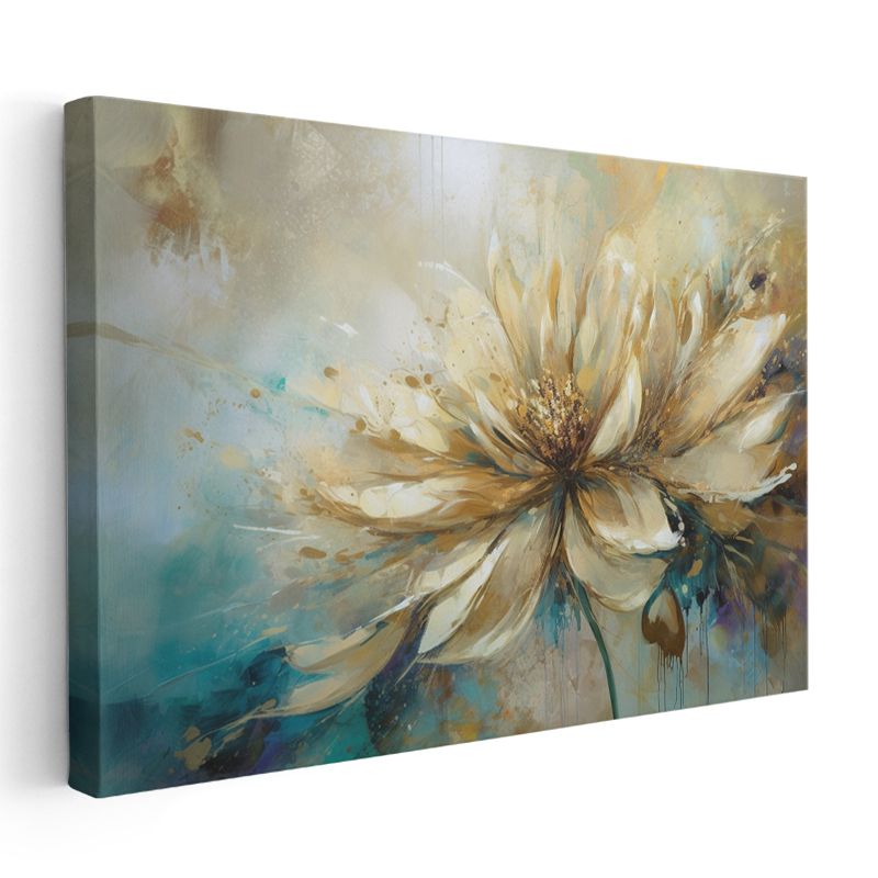 Krem Çiçek - Turkuaz ve Altın Tonlarında Soyut Tasarım Kanvas Tablo