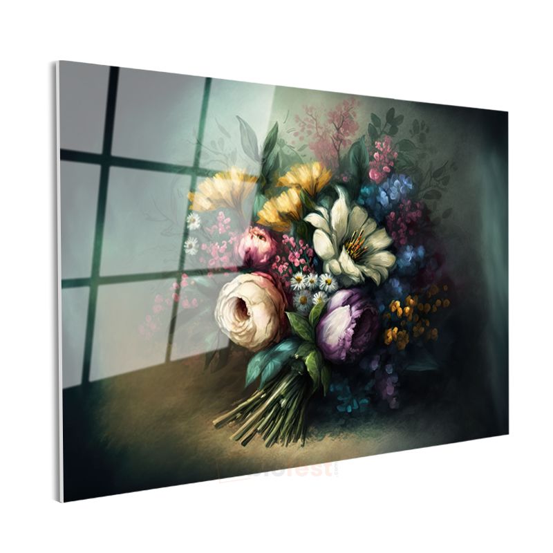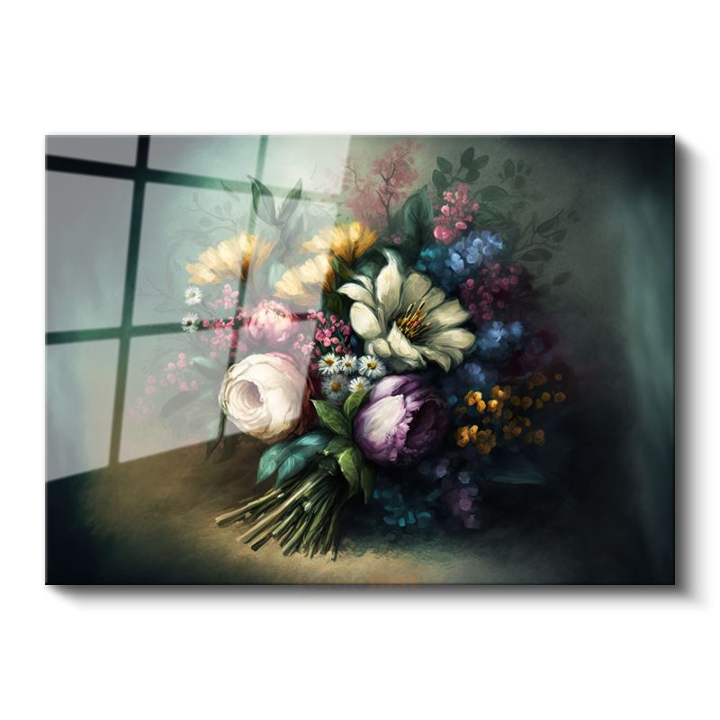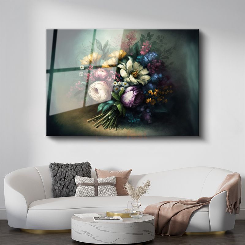 Krem Çiçekler - Mavi Fonda Zarif Çiçek Dalları Cam Tablo